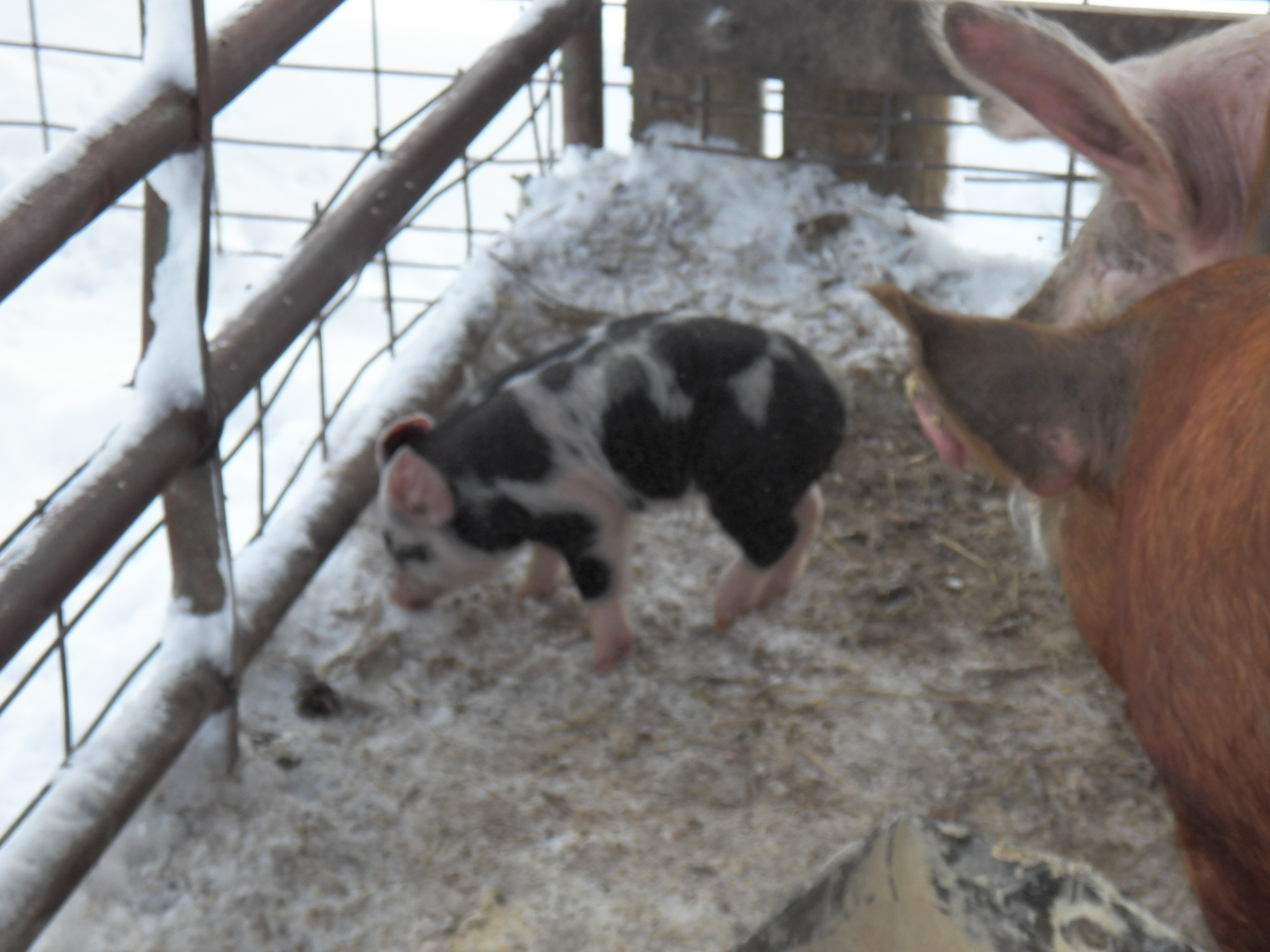 This little girl was born one night when the temperature was below zero. The wind chill the next day was minus 30 F. This little girl and her siblings stayed warm in a large nest of straw next to mom and a couple of aunts! She is three weeks old today and the ruler of the nest. She will be a replacement gilt in our sow herd. She has great confirmation. She is out of one of our best mothers and she is as cute as they come!