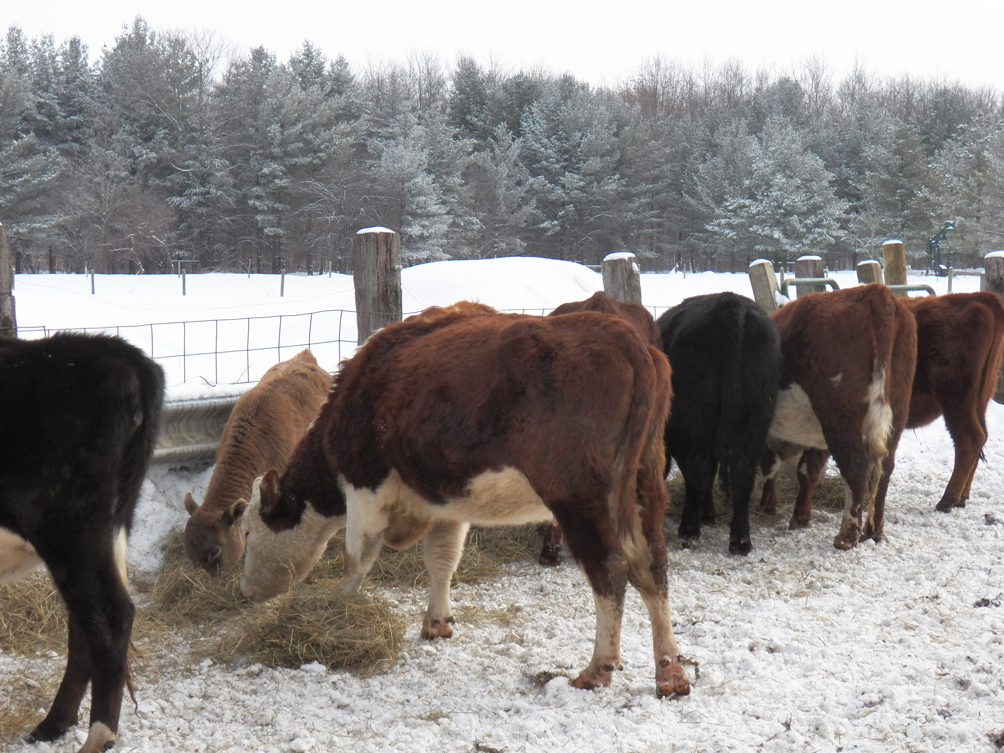 Every day I bring the cows up to the feedlot to look them over and make sure that all is well. I have created extra work for myself. The cows now stand at the gate, demanding that I come get them. I give them a small splash of grain and a bale of the same hay that they have out back at the cow stable. They eat the grain, then devour the hay.