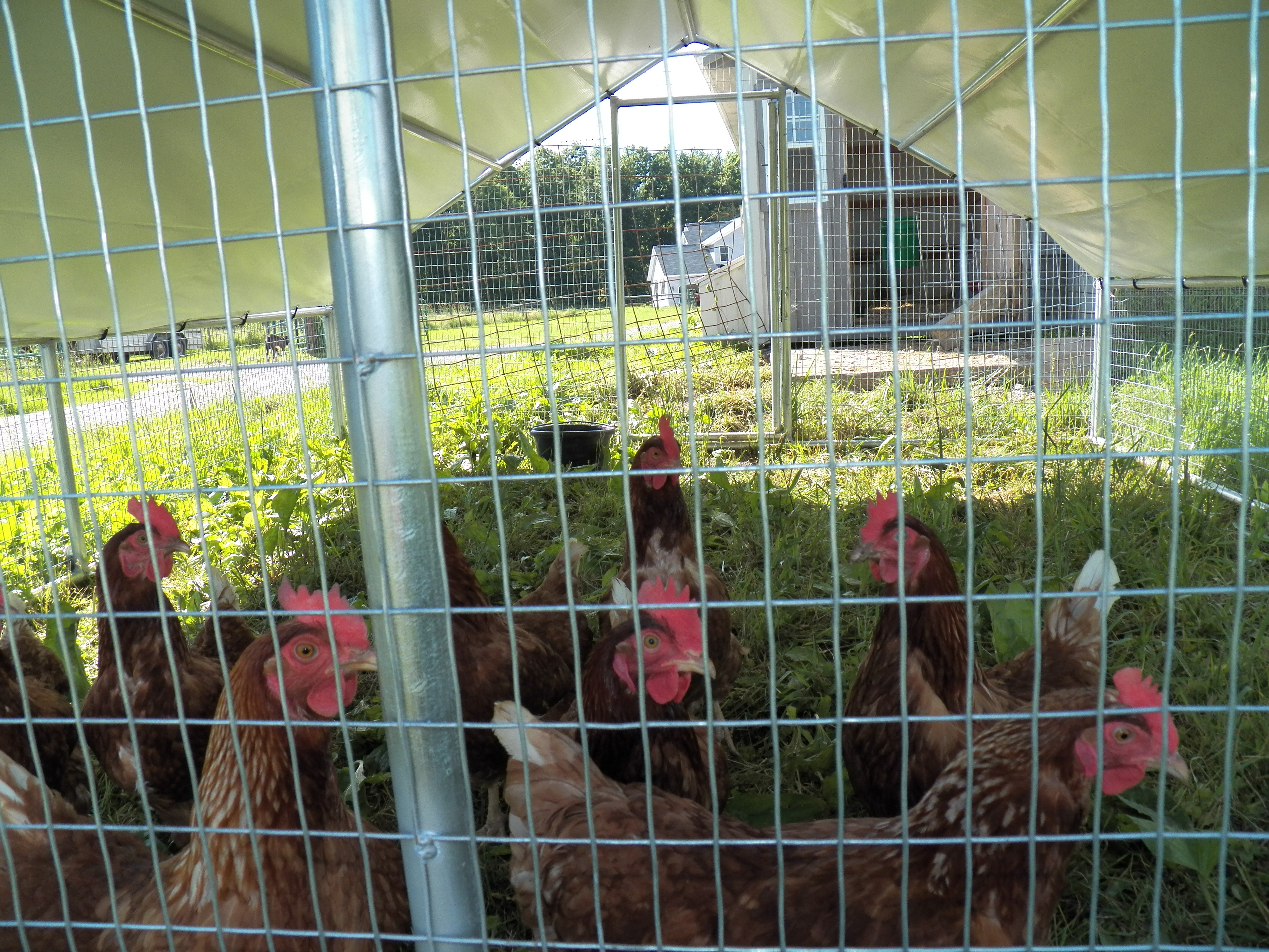 Our hens are really enjoying this portable shelter. It has very secure sides made from welded wire and conduit. It has a white canvas top to protect them from the sun and rain alike. It has wheels that lift it up when moving is desired and it looks good from all directions. The hens are safe from wildlife and the wayward neighbor dog intent on having a chicken dinner 😮