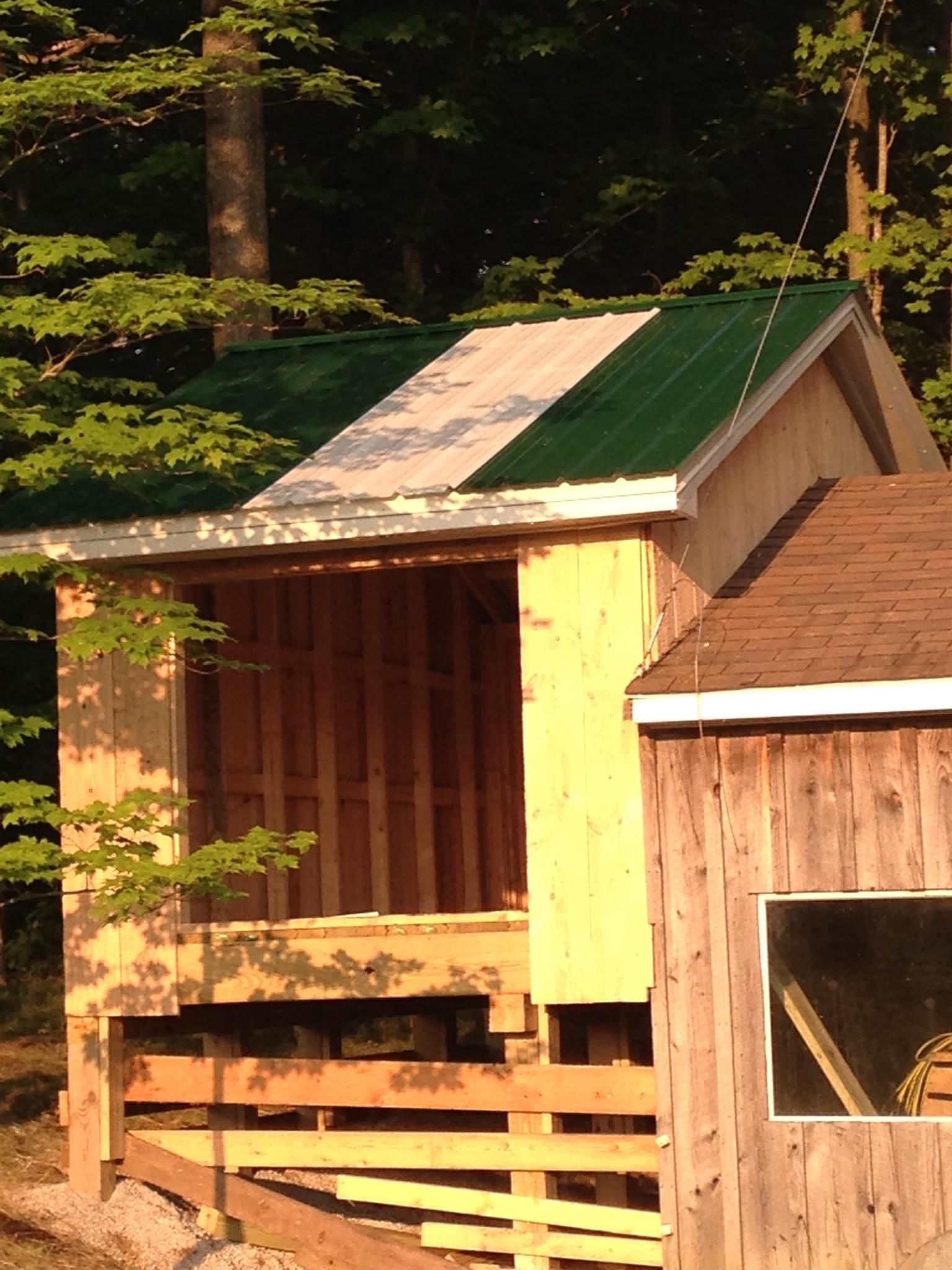 We managed to get the walls and roof on the sugarhouse addition. Only the doors and batten strips remain to be finished. The addition is turning out even better than I visualized in my head. We even put two skylights in the roof to make use of natural light. I know from experience that there is nothing like it. The big windows on the sugarhouse itself, let in much more light than I can make with a few bulbs. The manmade light works good at night, when piercing the dark, but falls way short during the light of day.