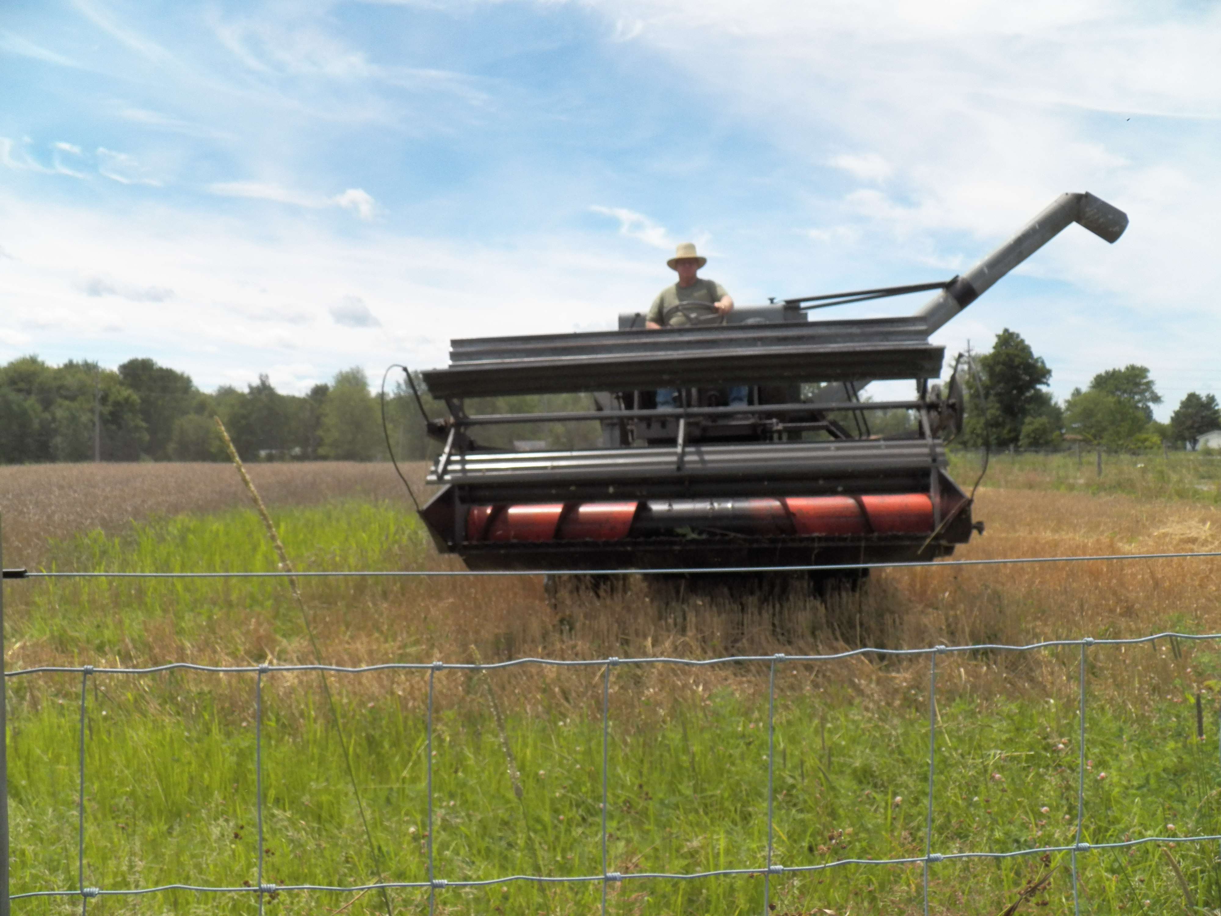 We adjusted the combine by getting “the book” out. I still have the original owner’s manual. She combined my speltz better than any machine I have ever used. She is almost as good as a threshing machine, but she takes a lot more work out of the job. I can see good from my perch up on the seat. I even watched my old cell phone fall in the header and disappear. It was like slow motion. I heard a little “zip” noise and my phone was gone…all except my “Otterbox” cover. It made it through.