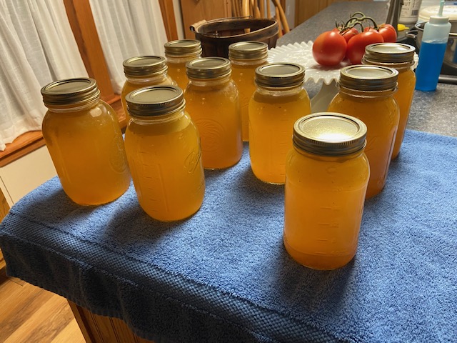Autumn brings much bounty. The last of the harvest is gathered. I accidently tripped the breaker on our freezer, causing some chicken parts to thaw. We spent a day cooking chicken and making broth. The shredded chicken will be nice too, but I am sure that it wasn’t on my wife’s agenda for that day. Oops!