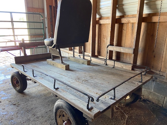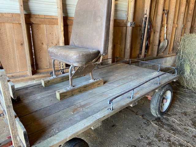 I had to make tire repairs and I switched the seat to this old school bus seat. I next forged the decorative buckboard rail to add some function. I hope it keeps stuff from rolling off. I forged the rails and made the brackets. Our grandson, visiting from Montana, welded the rails and brackets together. Then we installed them on the wagon.