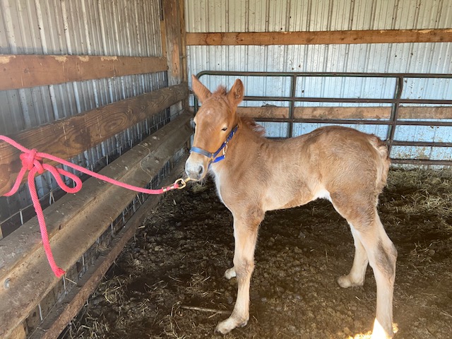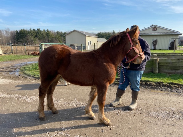 She learned to tie and lead very quickly. She has been a challenge at times because of her intelligence. She is a very smart horse who learns quickly. She also tries to outsmart me once in a while. As long as I correct bad behavior quickly, she yields. If I let her do something even twice, then she thinks that she is in charge and never has to do it my way again! She will be a great addition to our working horses because she likes routine. Do it the same every time and she is happy…change things up…not so much!