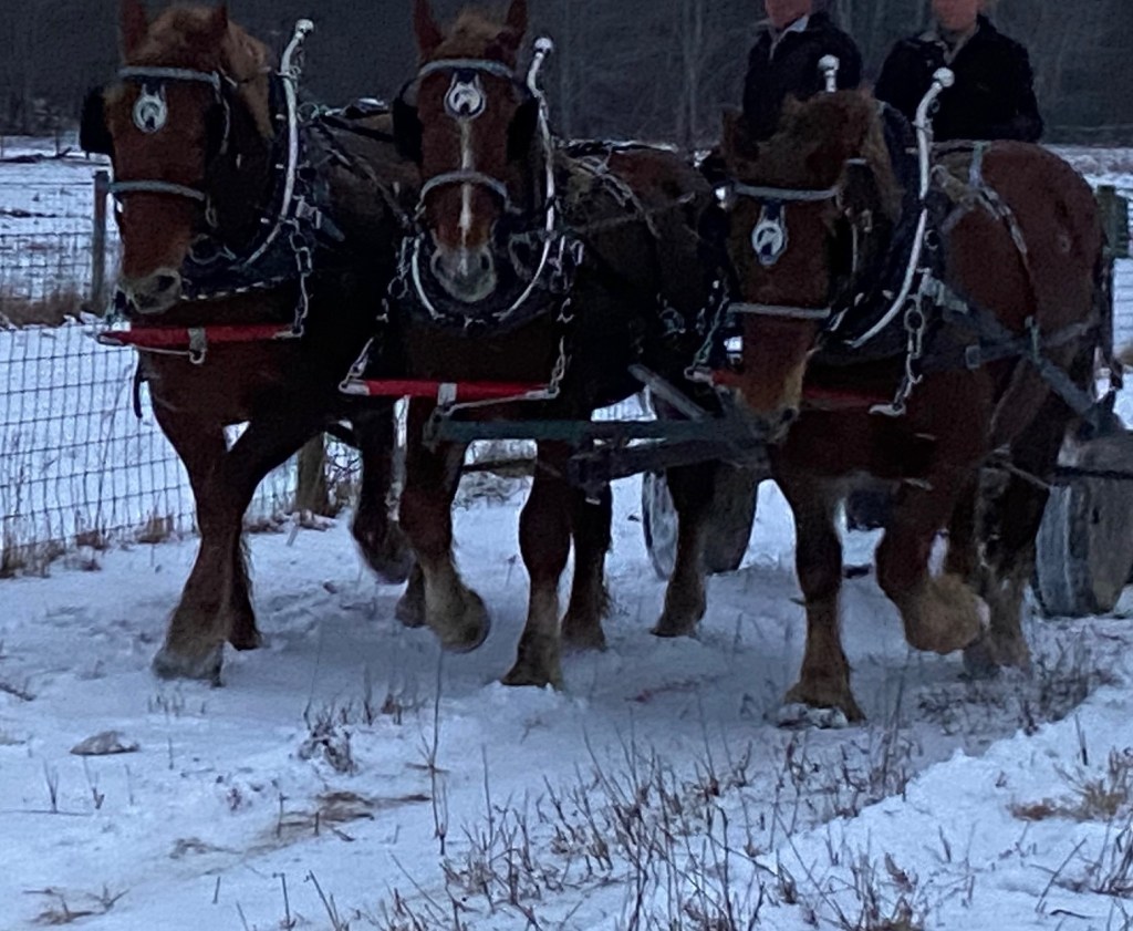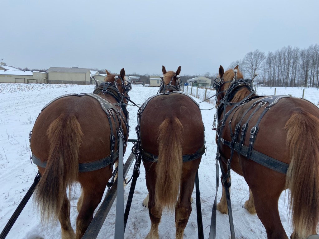 Here is a shot from the front. I had my buddy’s boys drive so that I could take a picture. This photo was taken on Hank’s first time in a three horse hitch. The photo on top was from his second time out taken the day before yesterday. Hank turns two in April. We do not work him hard, but we work him often.