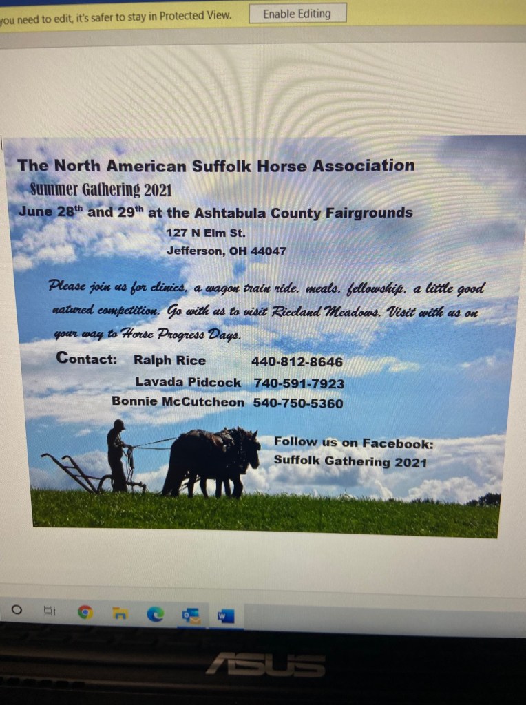 This coming summer, during the last week in June, we will be helping to host a “Suffolk Horse” gathering. We hope to catch folks as they travel to Horse Progress Days , a draft horse event held in Mount Hope, Ohio, later in that same week. We think it will be a great time to meet people and introduce these amazing animals to the public. We will hold the event at the Ashtabula County Fairgrounds in Jefferson, Ohio