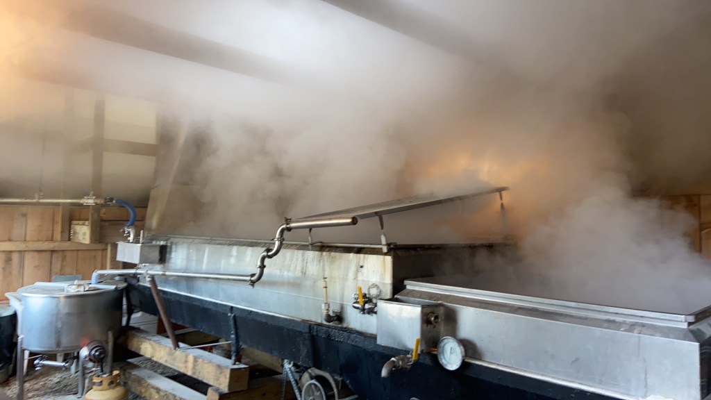 I had an idea this year to try and collect condensate water from the boiling steam. I made a sort of plate that sat above the boiling sap. I thought water would condense on the plate and I could collect it to use for a source of hot water in the sugarhouse. My idea did work, but it didn’t collect enough water to be a stand alone system. I took water back each day and filled a stainless steel tank. The condensate water added to this amount, that helped quite a bit. I will need to improve on this idea, because there is promise in my efforts.