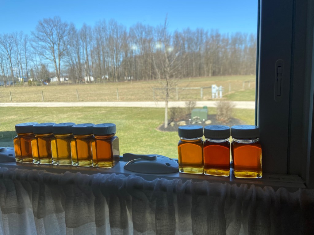 Our season lasted three weeks this year. We boiled just over 10,000 gallons of sap that yielded 167.5 gallons of maple syrup. Our ratio was 60:1, due mostly to the soft maples in our woodland maple mix. The syrup stayed light most of the year and has our distinctive “buttery” taste. We had friends and family help us with the process and quite a few visitors. It is a wonderful time of year for me, but I have to say, I am glad that it is over…until next year!