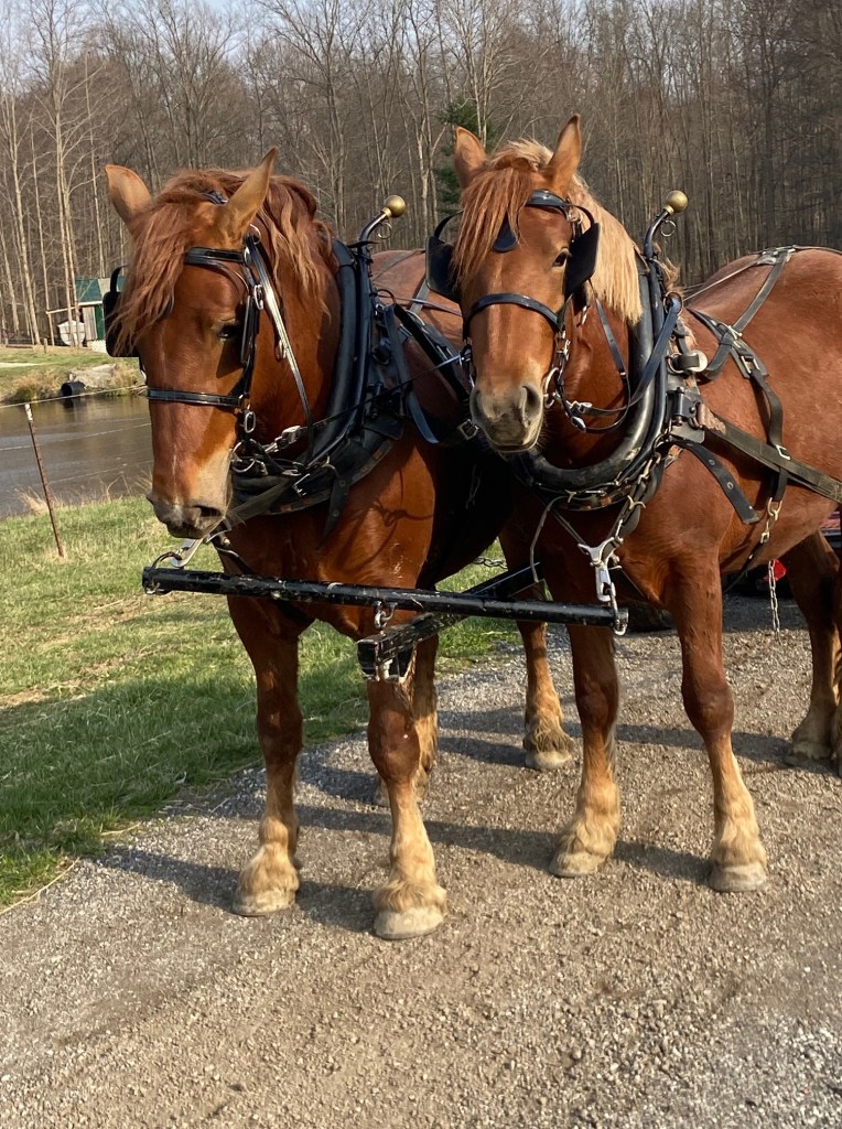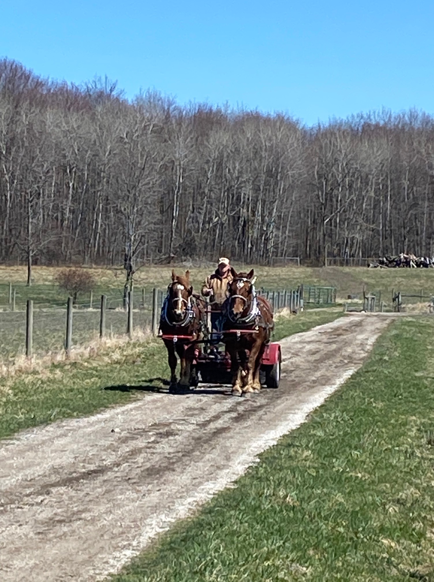Our nice weather continues. April Fool’s day and Easter are behind us. We are training our young horses. We hitch them as often as we can, daily when possible. Hank, the horse with the white stripe on his face, is doing great. This was his first time hitched in a team. We have used him in a 3-horse hitch several times, but today was his maiden voyage hitched this way. He did very well thanks to his teammate Abby. She is showing him “the ropes”.