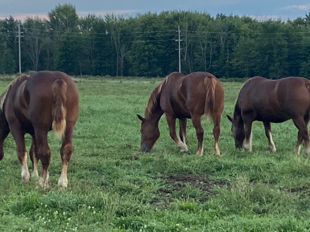 Once the fake boxing match is over, peace comes to the pasture. Hank and his girls graze contentedly, the work of the day forgotten.
