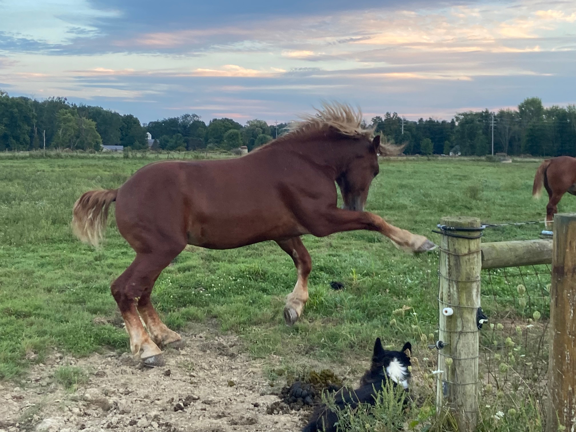 As we make the dash towards fall and the coming harvest, we still take some time for fun. Hank and Sam (the dog) play a game at turnout every night. Sam is not allowed to chase the horses. Hank knows that Sam is not allowed, so he plays tough guy showing off for his lady friends. Sam bolts to the gate, Hank kicks out in protest, a scene played out like teenaged boys full of vinegar!