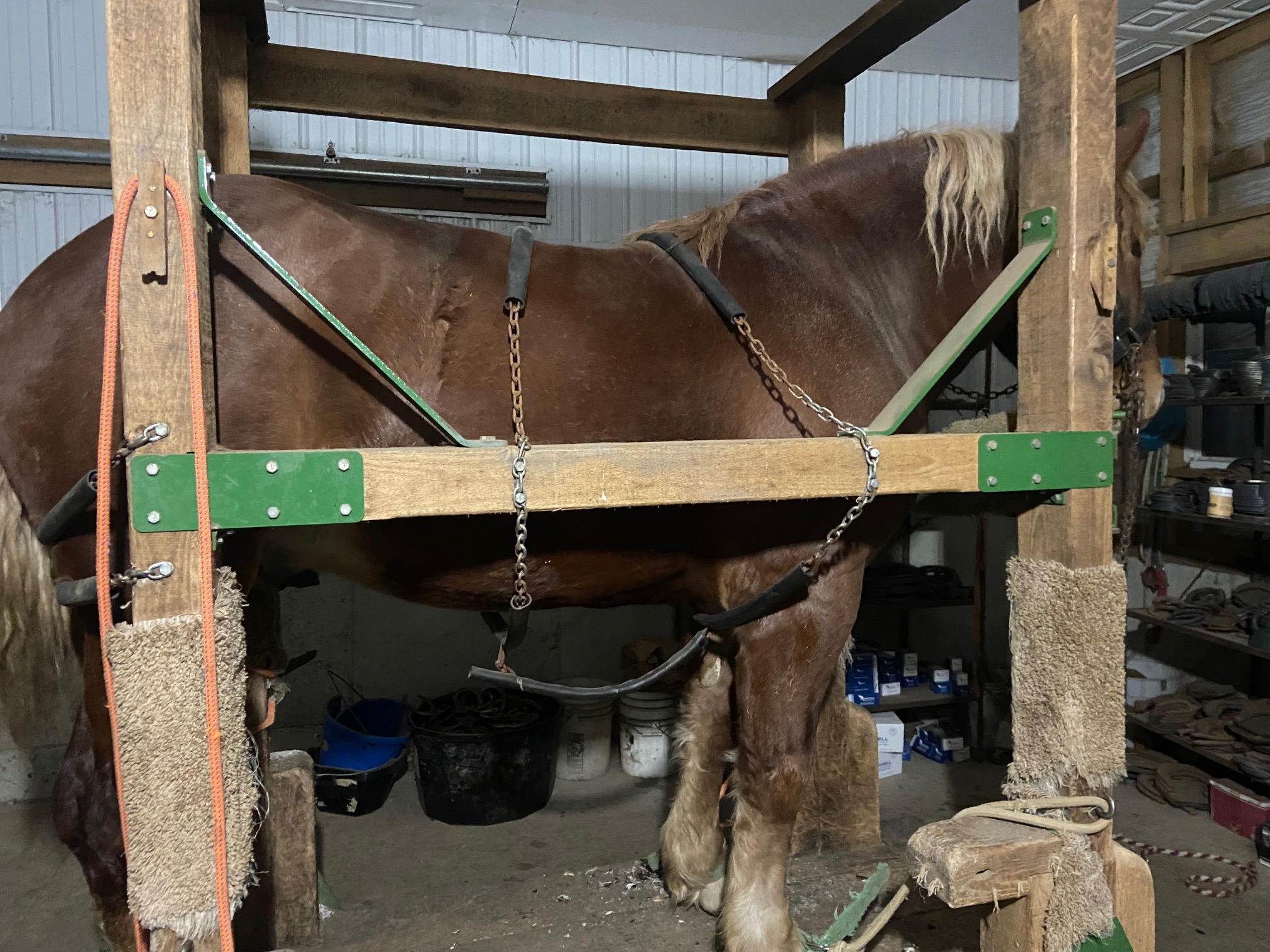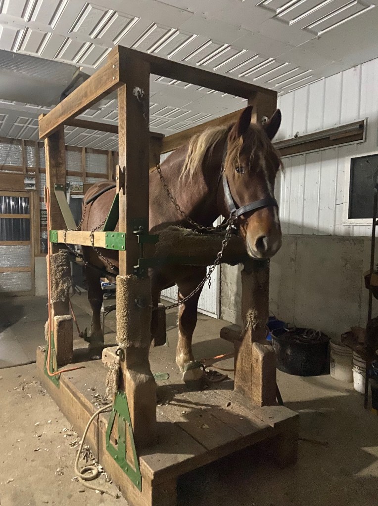Our three “main” horses that power our farm, all got their shoes reset. This makes sure their feet are trimmed and they are ready for the coming icy drive and laneway. Hank is coming along good. He took his shoeing and feet trimming all in stride. He will turn 3 next April. He is growing well and fills up the shoeing stock pretty well already.