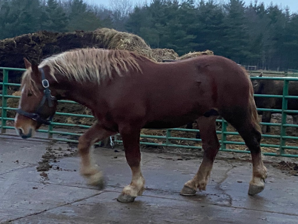 His best quality is his mind. He is a very likeable horse who has great manners. He doesn’t bother the ladies. Well, he may walk by close enough to get a squeal out of them, but he is just teasing. The mares are serious about no monkey business. He just walks away and minds his own business. When we work, he keeps to himself too. I really like this guy. He is a model stallion for any breed, but exemplifies the Suffolk Punch breed.