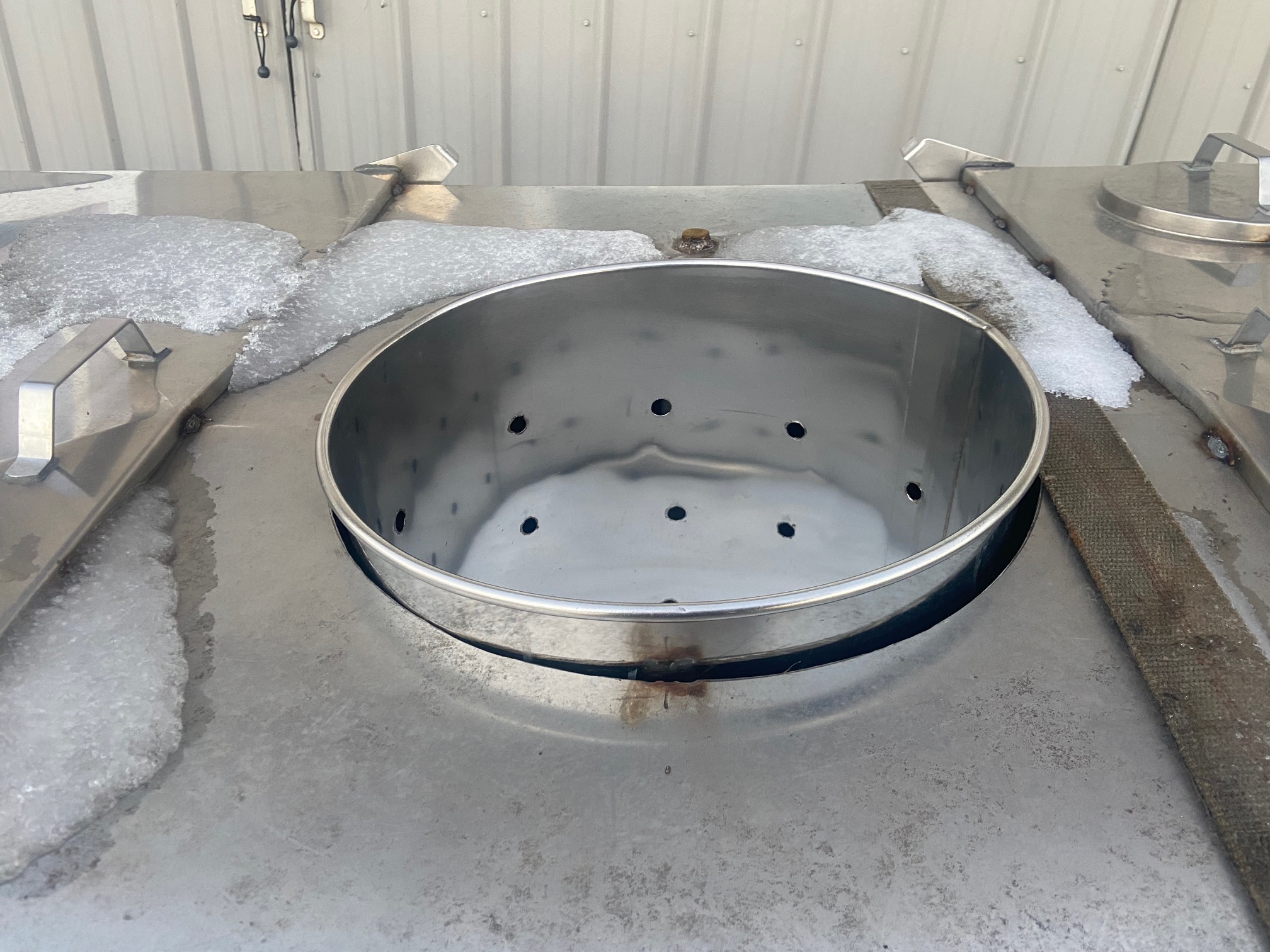 In the fencerow at a friends farm, I spied this old, small bulk tank. We made an agreement and I bought the tank for the cost of scrap. My buddy, who is a fabricator and welder, helped me rework the old tank. We welded the lids all in place. We cut a hole in the top panel to allow for this stainless steel drum. We drilled holes in the drum to act as a strainer and fill port for the tank. The barrel sits on four legs in the bottom of the tank making it removable.