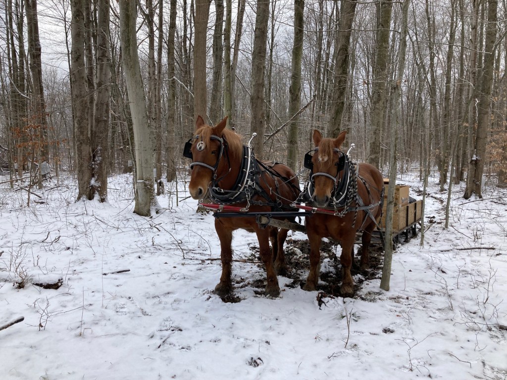 Abby and Amee did an awesome job pulling the sled while we tapped. A four wheeler or tractor would not have worked too well for us this year. The four wheeler would have gotten stuck in the mud and ice or perhaps even in the deep snow. A tractor would have made some awful ruts in places. The horses were steady and traversed the sap roads with ease.
