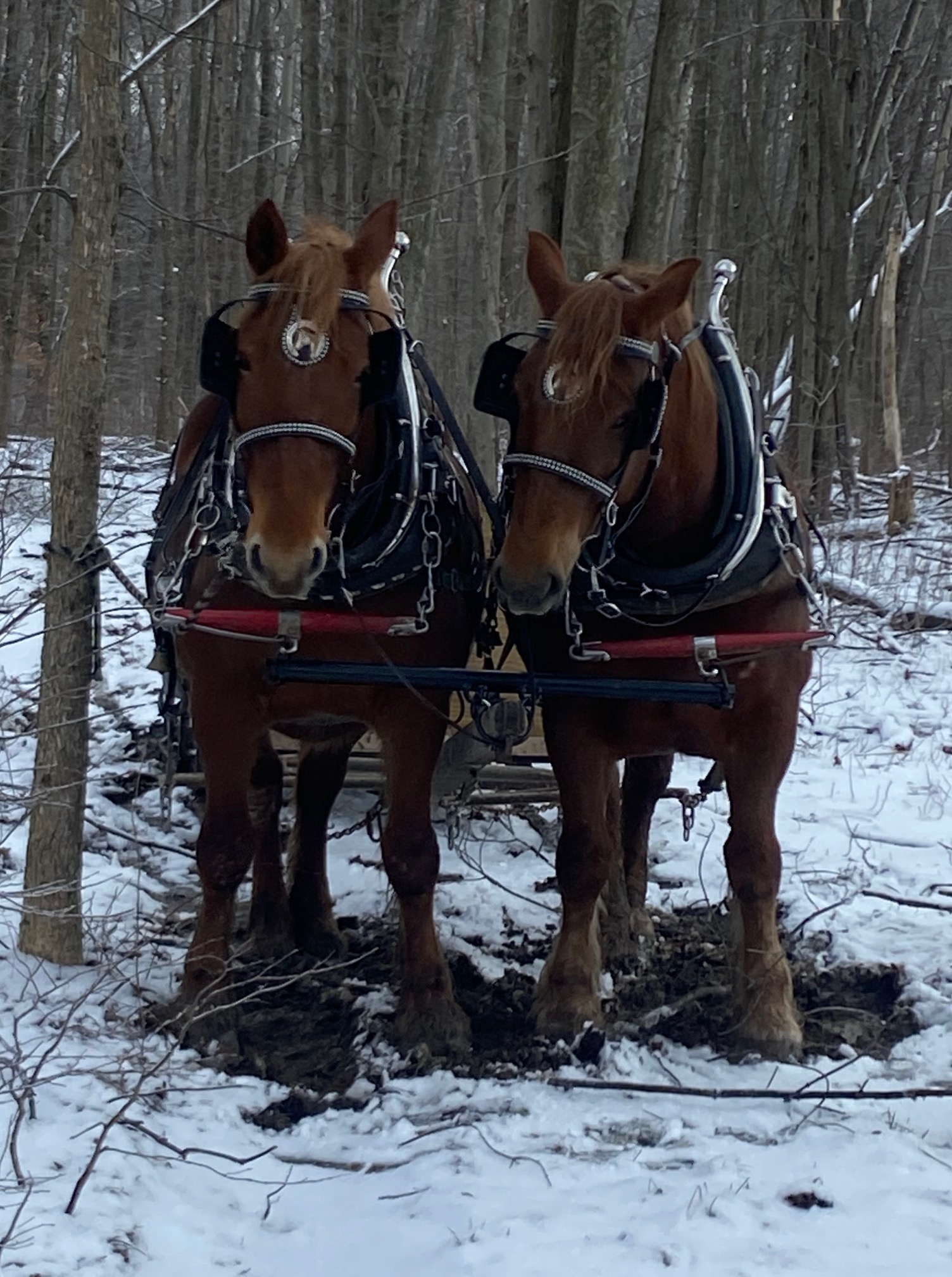 Abby and Amee did an awesome job pulling the sled while we tapped. A four wheeler or tractor would not have worked too well for us this year. The four wheeler would have gotten stuck in the mud and ice or perhaps even in the deep snow. A tractor would have made some awful ruts in places. The horses were steady and traversed the sap roads with ease.