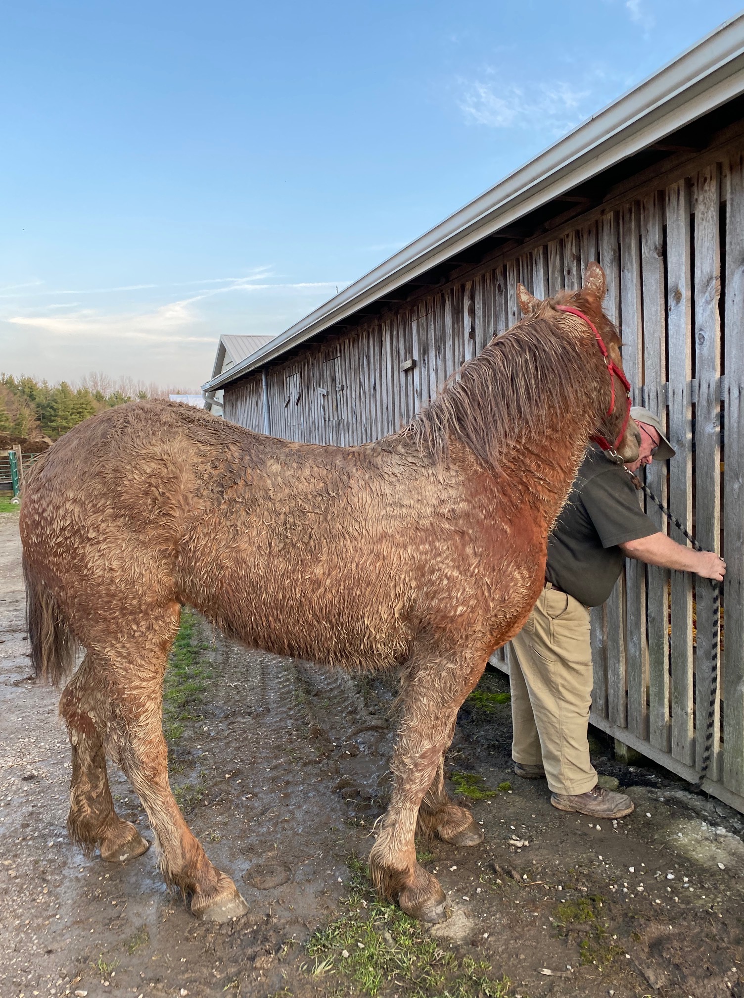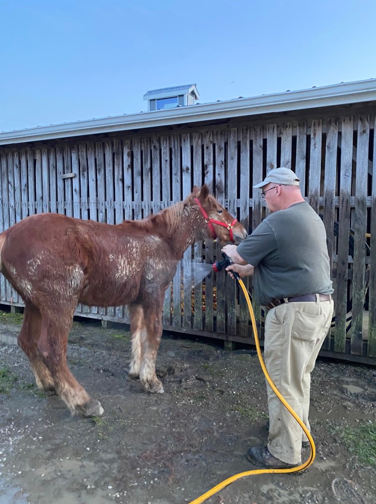 Our yearling Grace got her first bath too. Her baby fuzz is slow to shed, but is finally giving up. Soon her coat will be the shiny chestnut that the Suffolk Punch are known for. She took it very well after the first squirt. I think it was the hissing noise more than the water itself that gave her pause. She eventually just stood quiet as I washed her with the warm water.