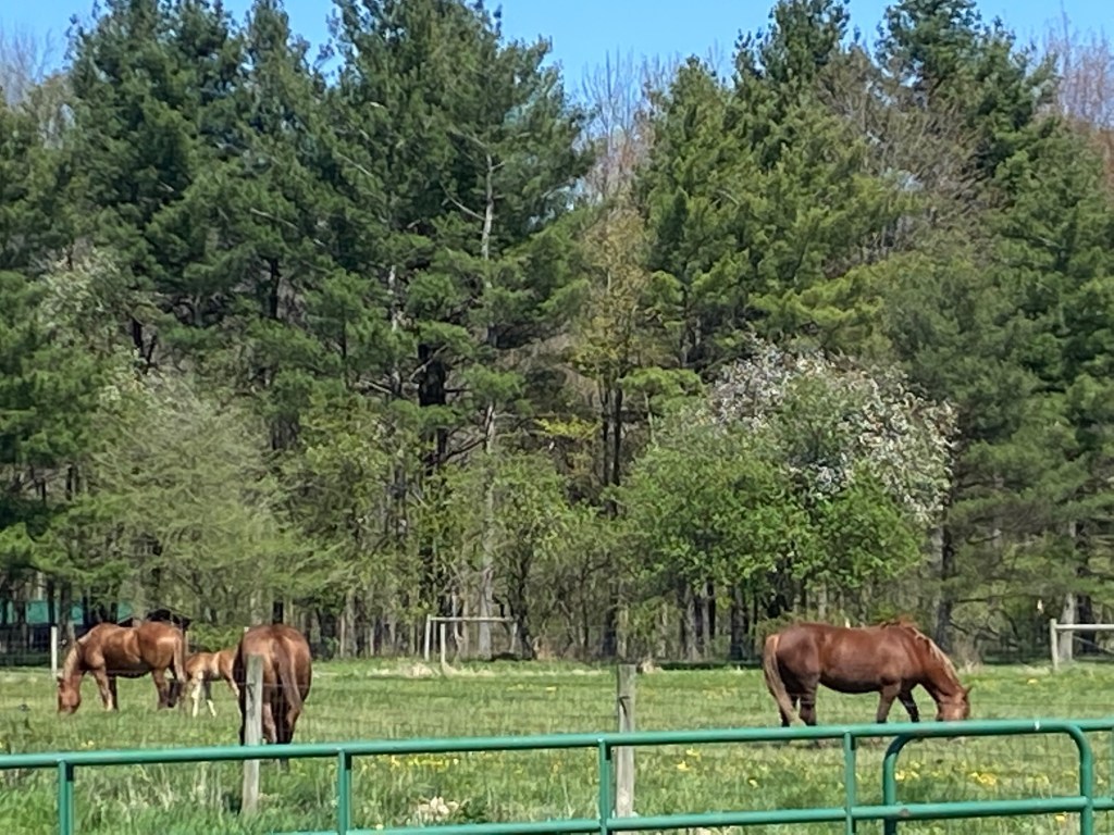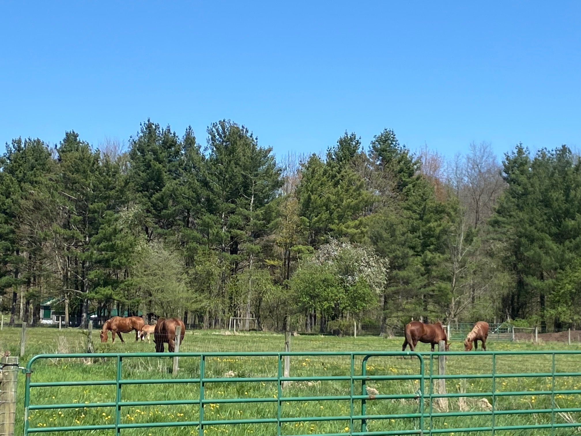The pastures are rich and the grass is fresh. The horses are enjoying it. The sunshine is wonderful after a dreary rainy month. The pastures are a bit wet, but we needed to get the horses out. Hay is running low. Plus Amee and Maggee need the added nutrition the growing grass provides. The sunshine too is good for all.