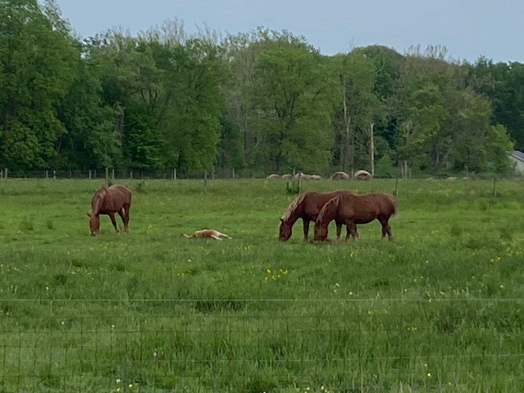 Hank, quietly grazing with his small herd. The baby filly pays him no mind as she slumbers nearby.