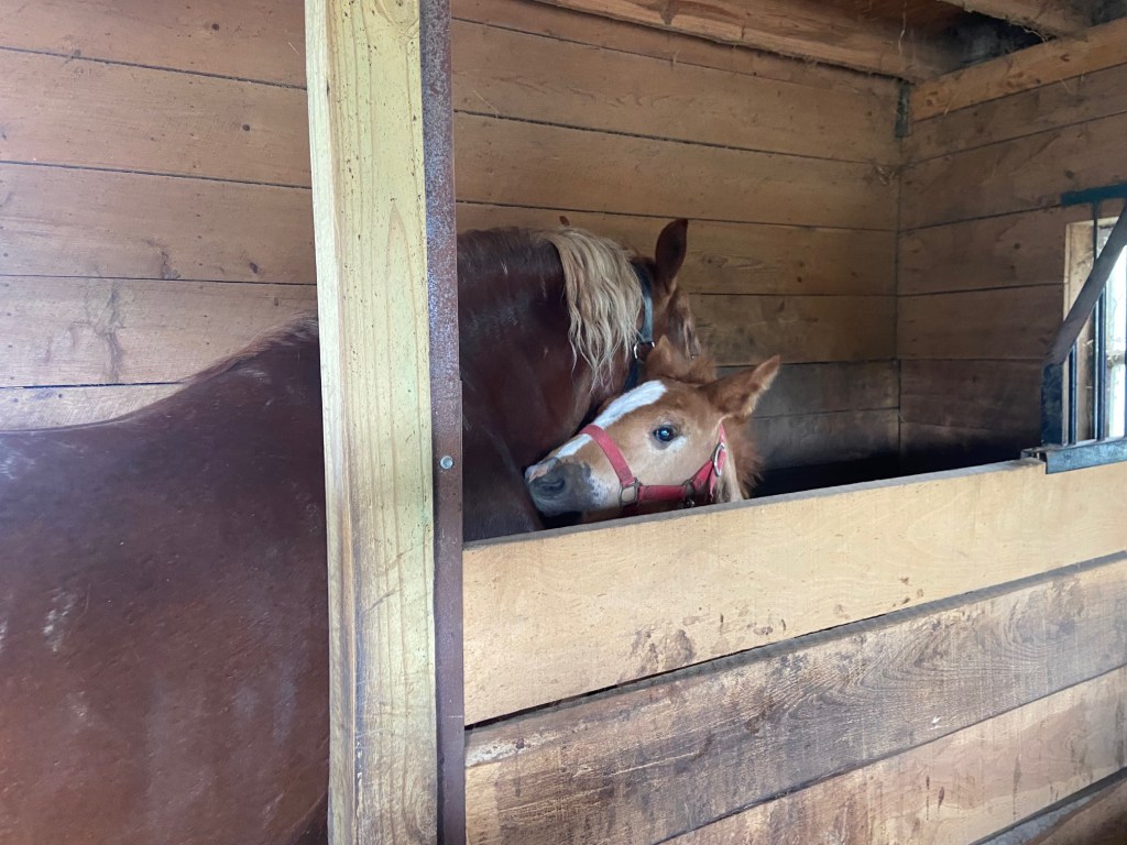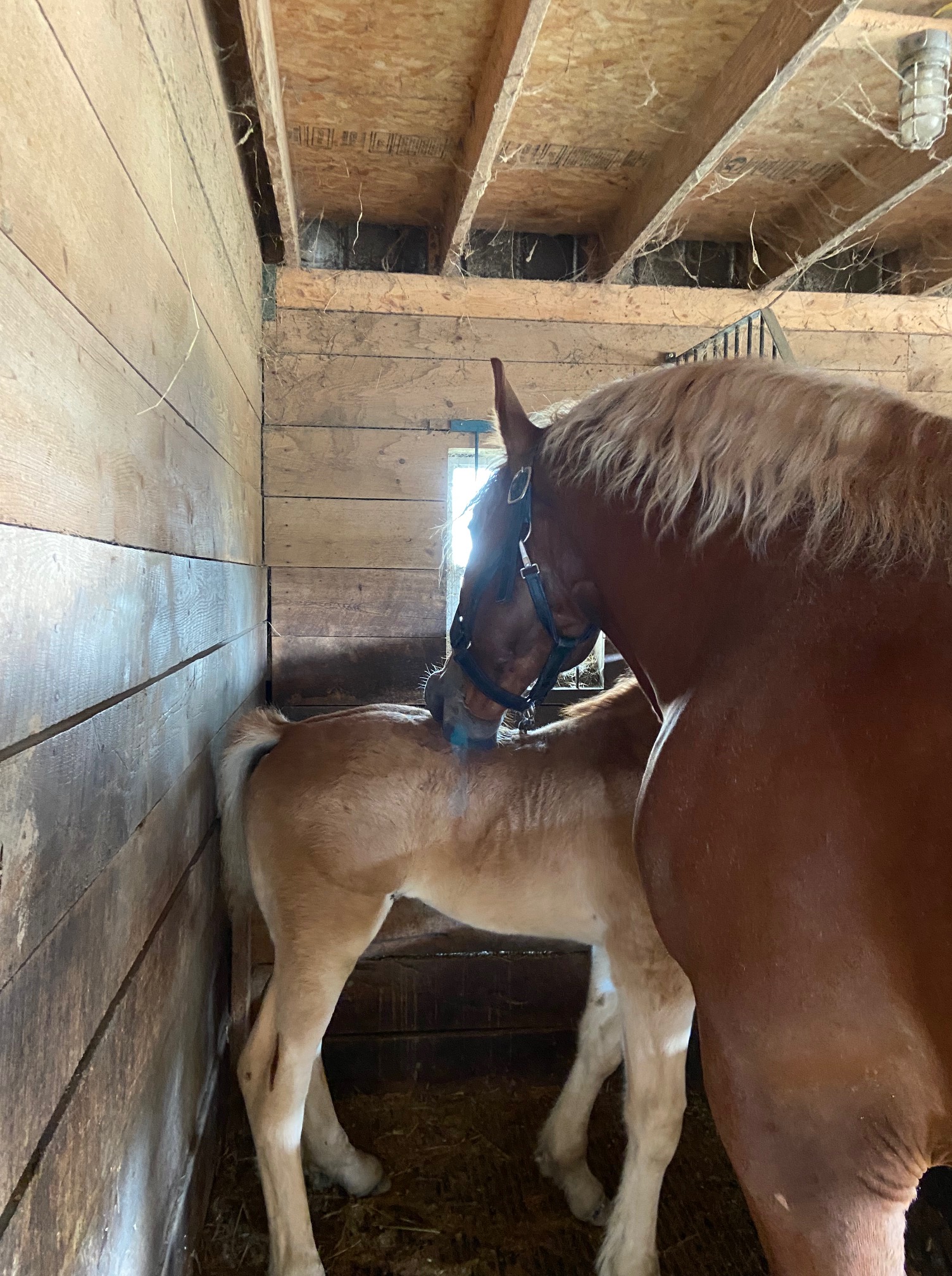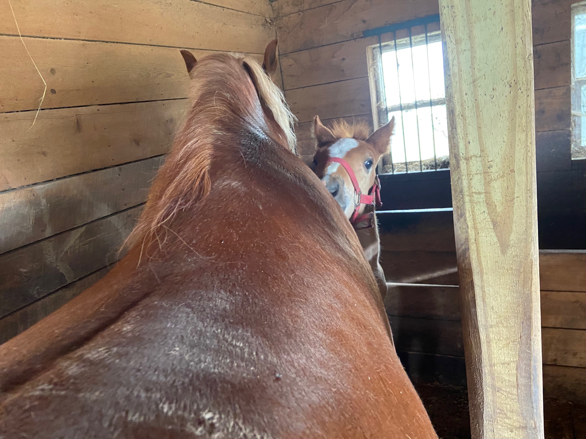 Our newest filly Maggee gets the run of the barn during the day. She visits Hank, who softly grooms the youngster.