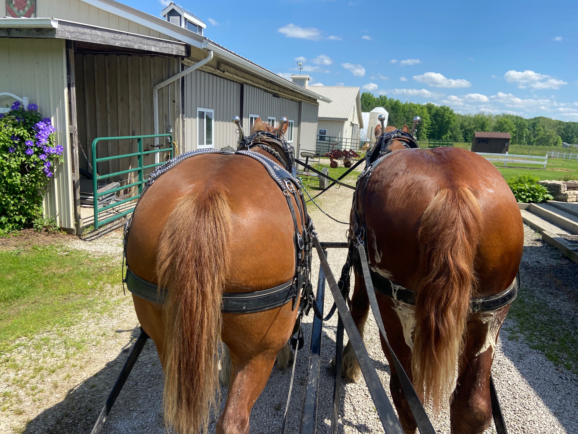 Today was a good day for training. Hank, our stallion, is on the right. He is sweating from a little work, but mostly nerves. Look at Abby on the left. She has done the same amount of work, but she just walks along taking it all in stride. Hank wanted to fuss a little and be out in front pulling much of the load. He was wide awake and looking for anything to be mad about.
