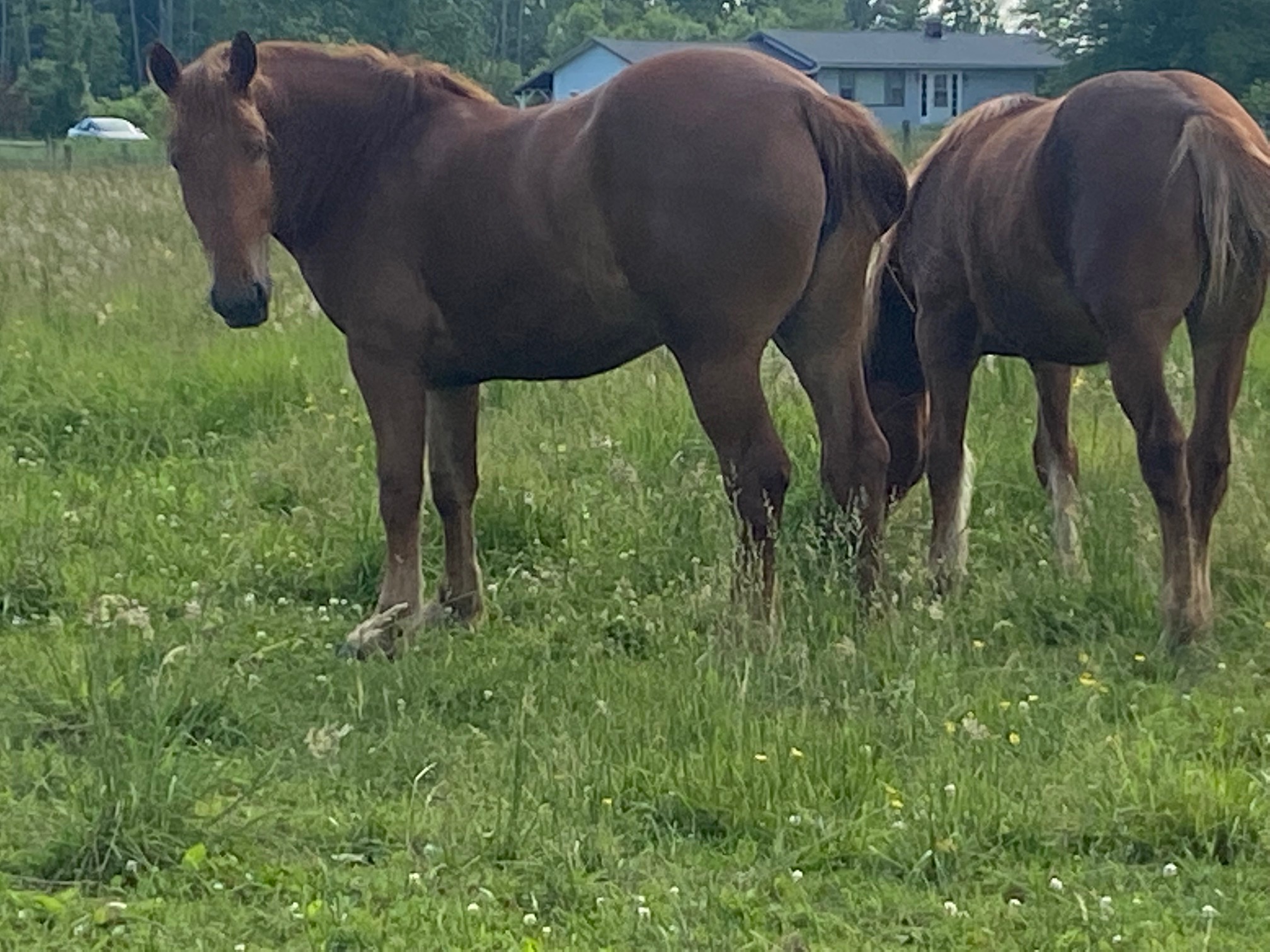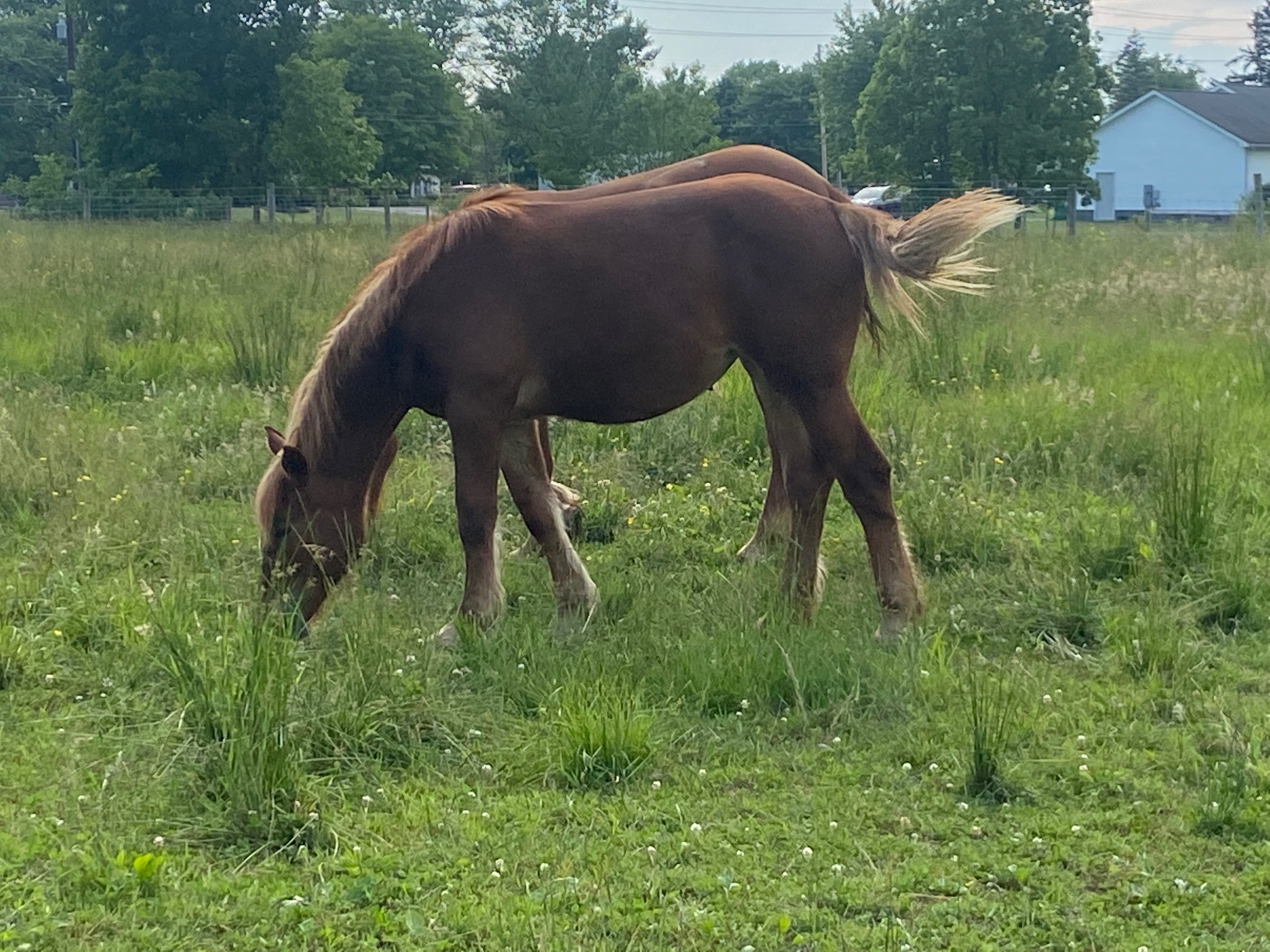 This is a picture of out two fillies side by side. Riceland Meadows Amazing Grace is in the foreground. She just turned a year old in April. She is gaining on her older pasture mate quickly. In height they are very close, but Bree is a chunkier gal. The breeding lines are a bit different, but both fillies will make good workhorses and great broodmares.