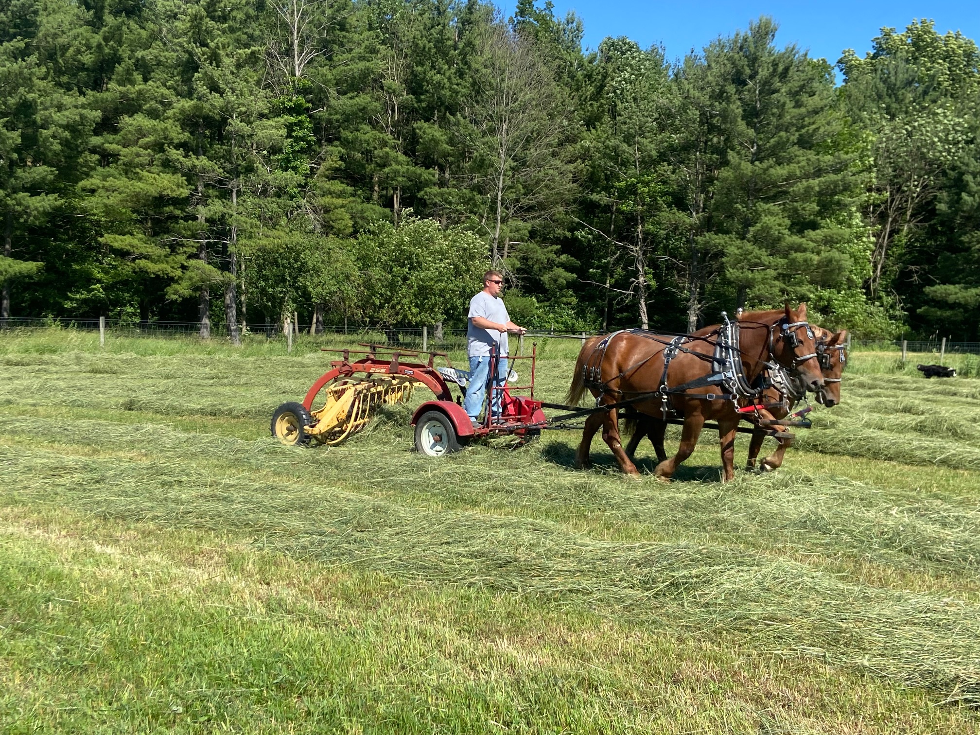 Our son Jake and I split our teams up. We put each one of his younger horses with each one of mine. This made for two great teams of working partners. Belle and Abby are pulling the tedder, fluffing the hay to cure and dry.