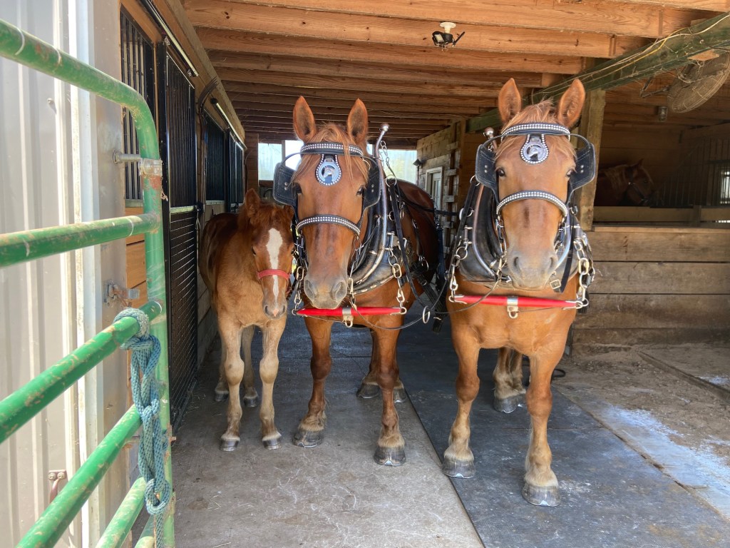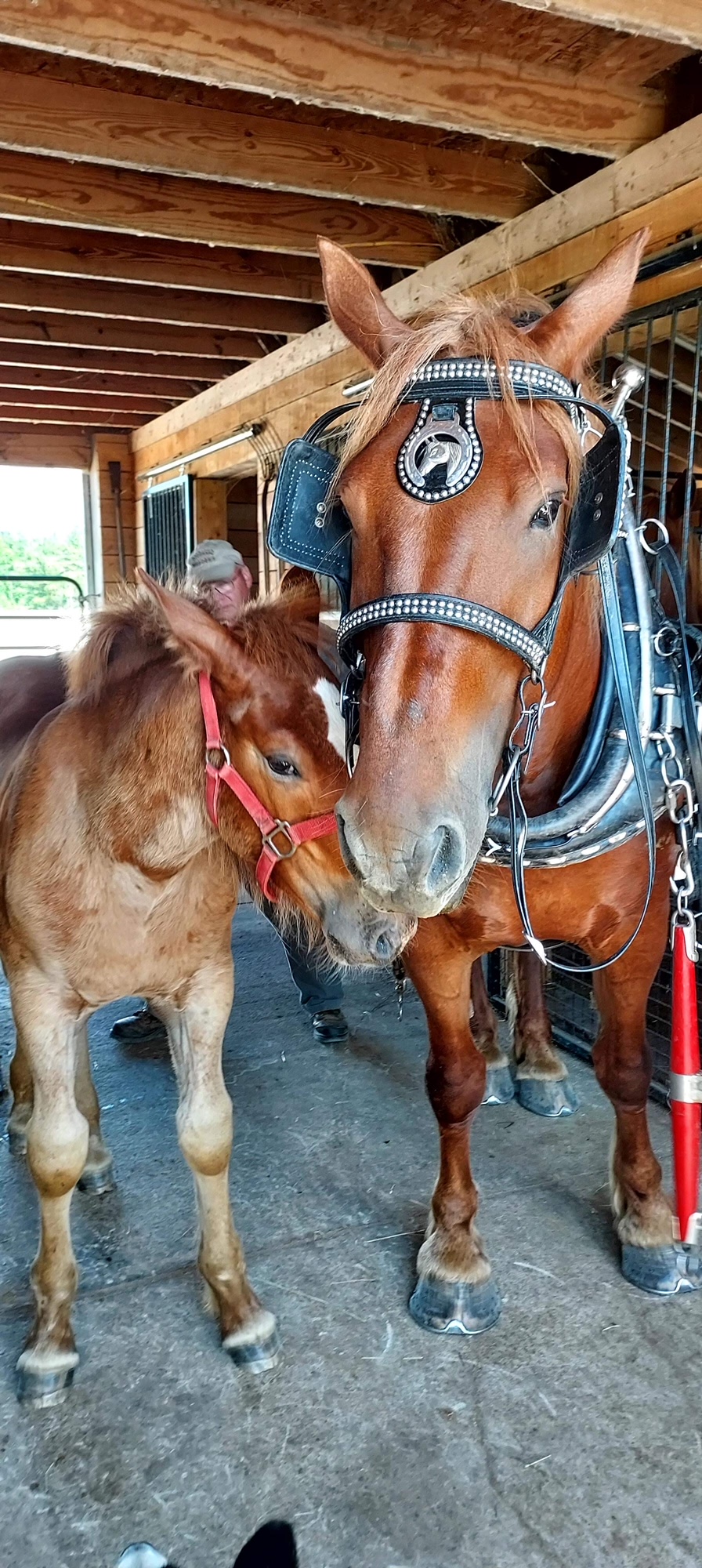 Maggee, our 2022 little filly, went to work with mom last week. She is learning all about farm work. Mom Amee and her teammate Abby, had to rake the straw from our recent speltz harvest. Maggee, is tied to mom and gets to walk along while mom works. This is a great way to introduce the youngster to noises and situations that she hasn’t seen or heard before.