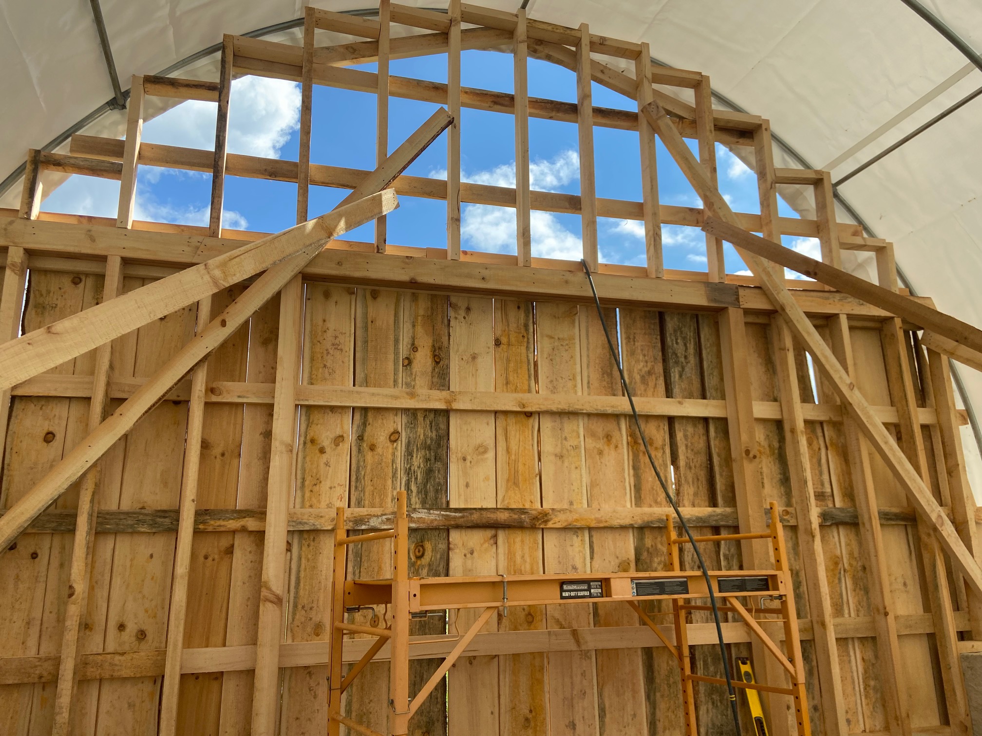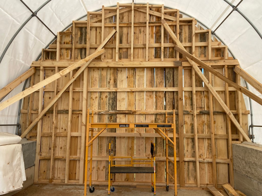 I was finally able to gather friends and have a short frolic here to build an end wall in the hoop building. This wall will keep out the driving north winter winds. It seemed almost ironic to be building a wall to keep out the cold, on a very hot, muggy day. I am grateful for the friends who helped and for the farm forest as well. The lumber was all milled here from trees off the farm.