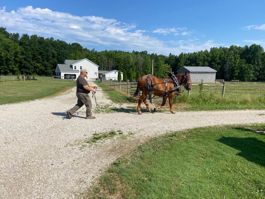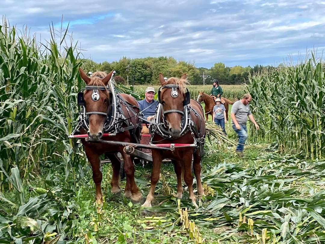 We raked the brush hog debris off of the field that we would be plowing. It was Anna’s second or third time on that piece of equipment. She was confident and willing while we raked. We next hauled bundles of corn shocks off the corn field following a corn binder demonstration. The horses had to stand, wait and move up as the volunteers loaded the wagon. The chattering binder being pulled by a team of Belgians, went by us several times. Our horses made no move, other than to watch them go by.