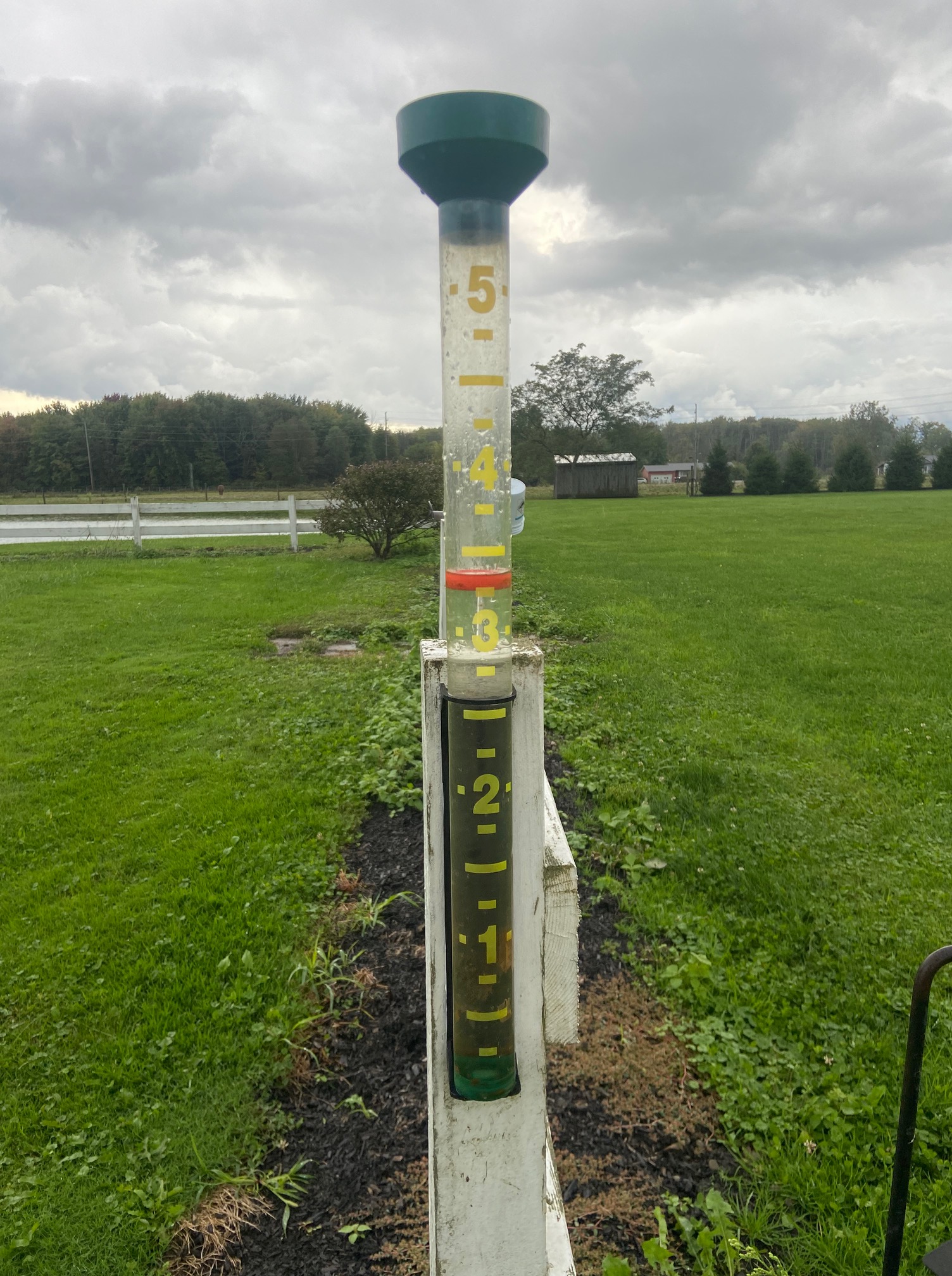 Our rain total yesterday afternoon. The rains continue to fall as a big storm comes to us from Canada. The storm moves over lake Erie, then dumps the moisture on us. We had a dry summer, but we are now starting to get a bit soggy. They say we still have another rainy day coming after today. No worries. The trees and grasses are gulping up the moisture in the waning days of the growing season. The other benefit is that we don’t have to shovel rain! The almost three and a half inches of rain that fell yesterday has been added to significantly over night. The sun is shinning for the moment, so I am headed out to do all things “Riceland”.