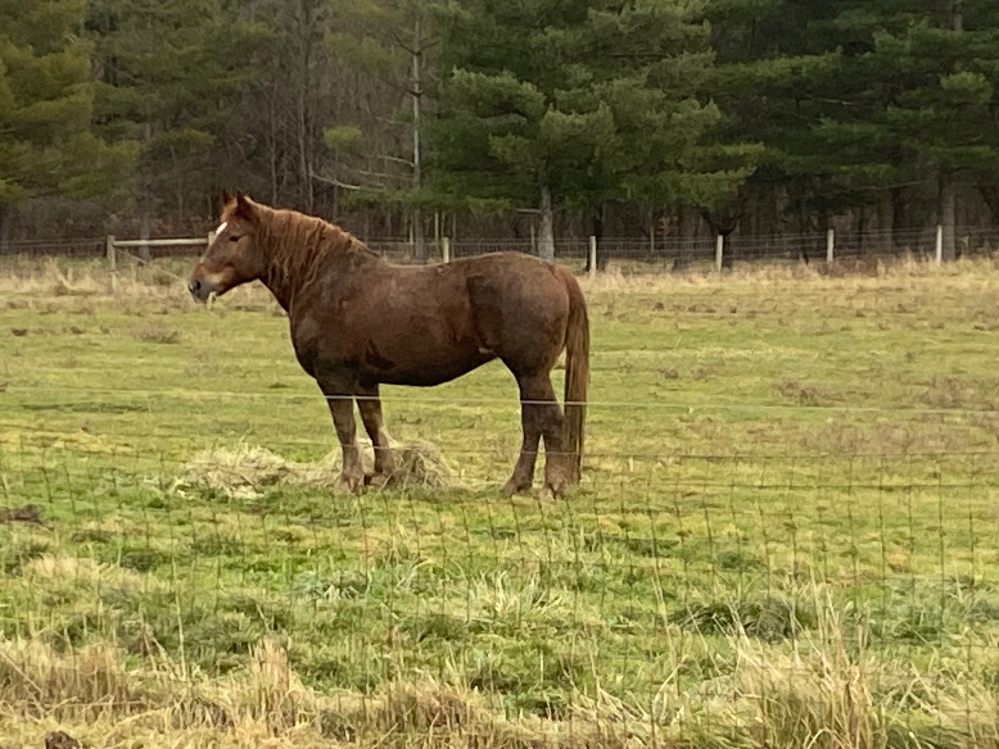 We found this dear lady in Canada. She is a full sister to two of our registered Suffolk horses and a half sister to three others. She is twelve years old and has been earning her keep on a produce farm near Montreal. We picked her up in Buffalo last Friday. so far we like her real well. She and our Hank have no shared DNA, so she will be a valuable asset to us in our breeding program. More importantly, she will help us teach youngsters, horses as well as children.