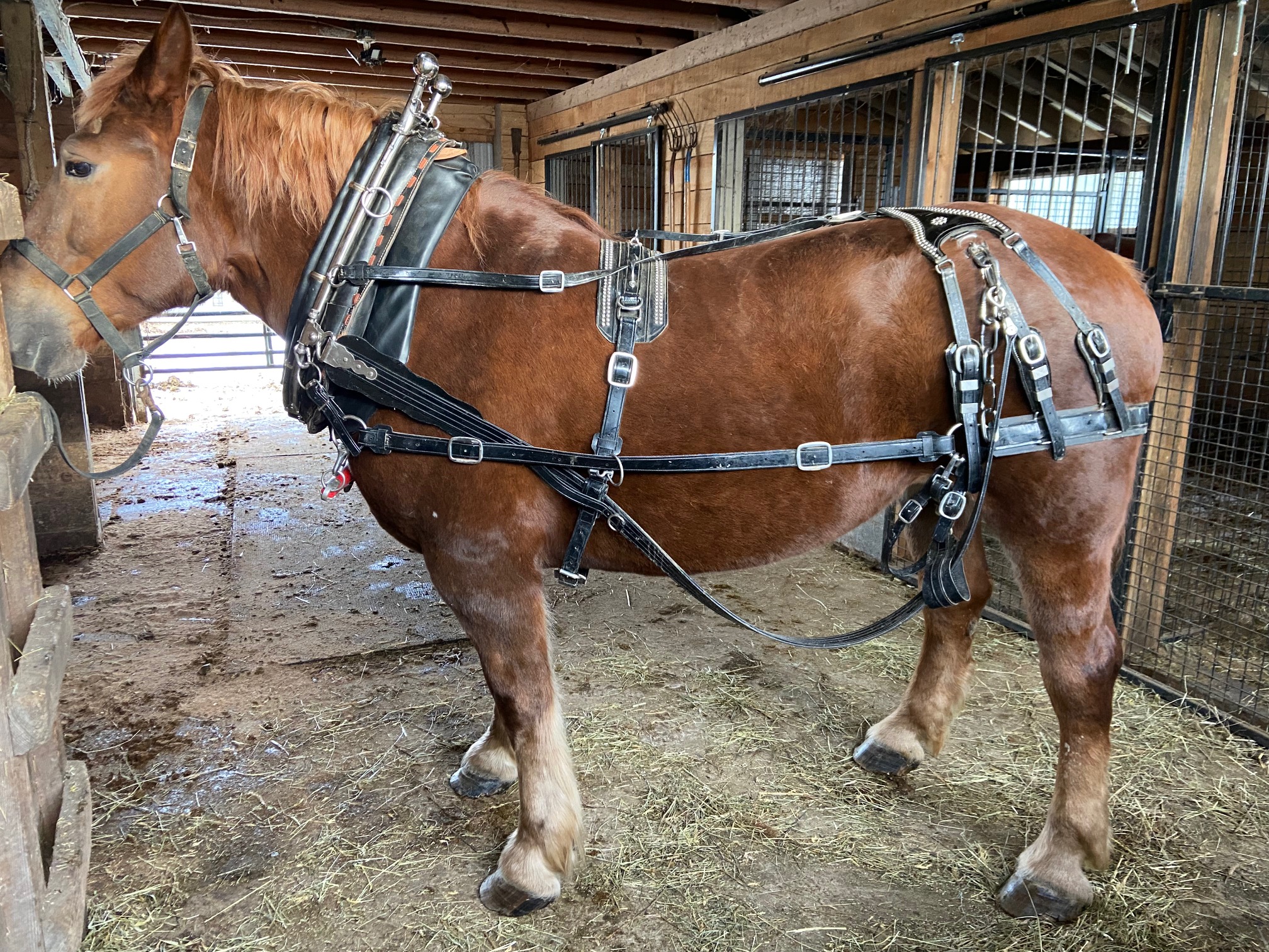 I think she even understands the “drill”. She stood quiet behind Hank our stud to be groomed and harnessed. You would think she had done it her whole life. No monkey business from either horse, just calm and quiet. I do love these Suffolk horses!