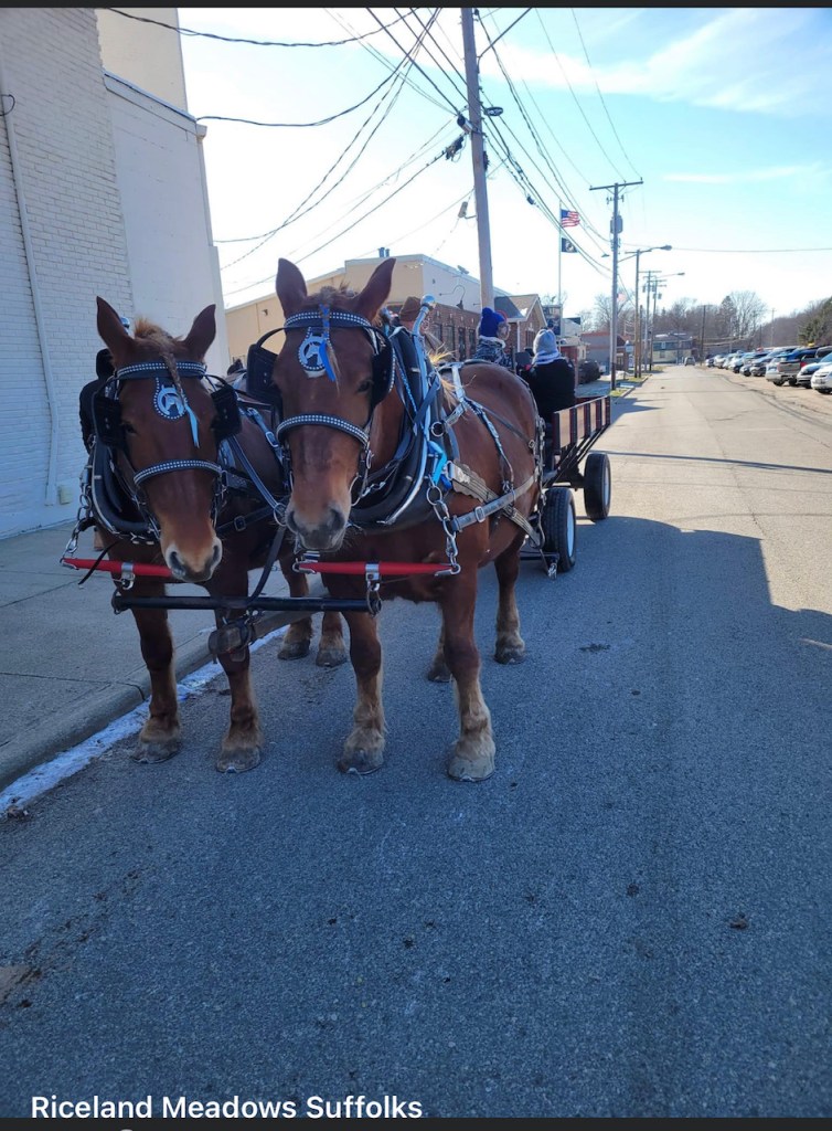 What a crazy busy month it has been so far! We started out very cold and seasonable. We attended a local chamber of commerce event in the nearby town of Geneva, Ohio for their Winterfest celebration. Amee and Abby were well dressed for the occasion. They got their manes and tails braided and all shined up to give wagon rides. The street looks lonely, but believe me it was bustling, just quiet at our loading zone.