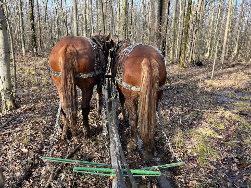 I am using our son’s horses to gather sap this year. Our main team Amee and Abby are both on maternity leave. These youngsters have been doing a great job. We haven’t had much snow, but the mud has been plentiful.