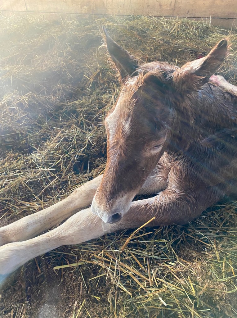 We were filled with emotion as “Tug”, our second foal of the year was born. He was a little slow getting going, but once he figured things out, he was off and running. He, along with his mother, half sister Joy and her mother Abby, were all out on our big pasture. The foals could run and rest in the warm sunshine. Tug jogged around and nursed often.