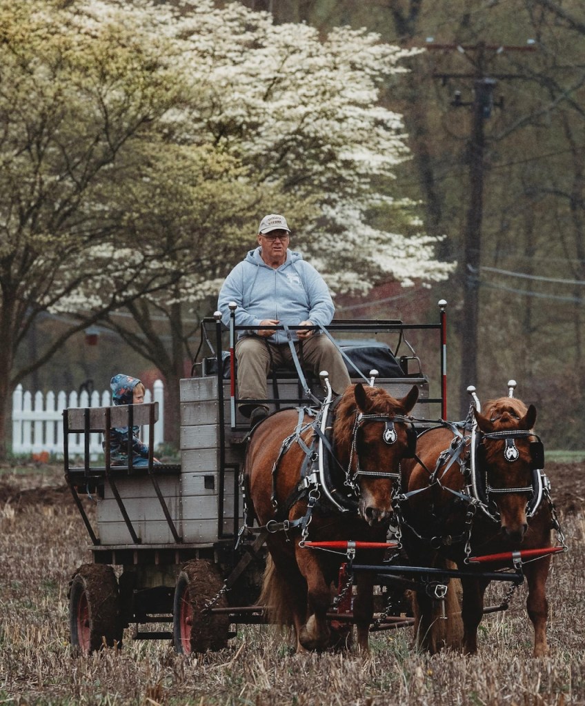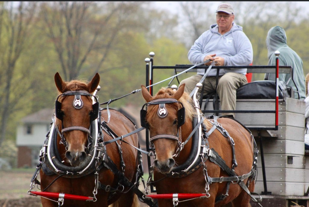 We had a good time in the drizzle at Joel Baldwin’s 3rd annual Plow Day last Saturday. I used our son’s team Belle and Anna to give wagon rides. There were 20 horses and their teamsters in attendance. The crowd watched from the road, in the field and walking among the plowing teams. It was a fun day.