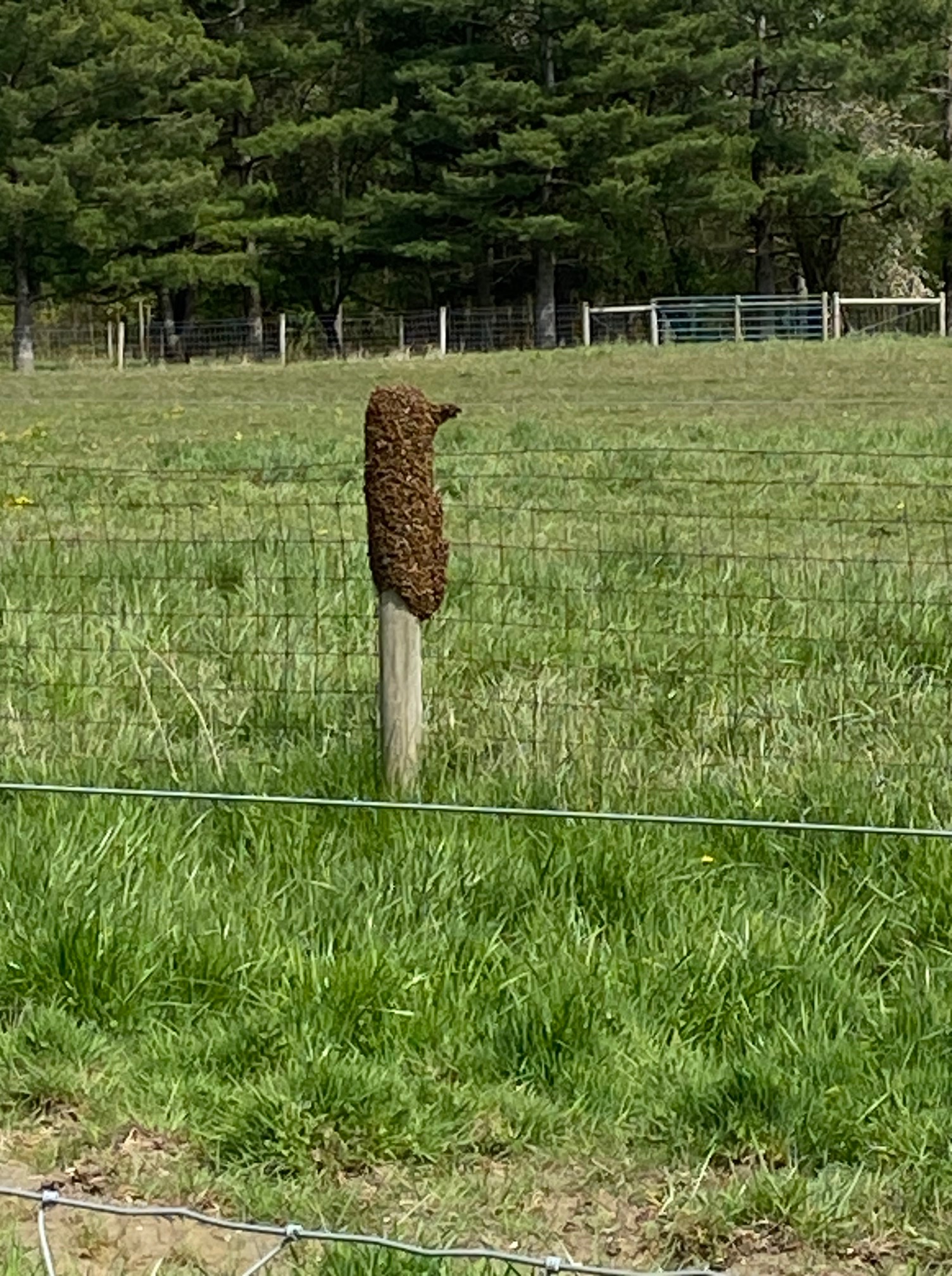 Late this afternoon I captured this swarm of honey bees. It is my first one of the year. It is a dandy too, almost 5 pounds of bees. I managed to catch the queen in my first attempt. I got her into a small hive with about half of the bees on the post. It is easy to get a swarm that is hanging off a limb, but a 360 degree post with bees all in the woven wire too, is a big challenge! I swept a second bucket of bees off the post and shook them at the hive entrance. In about fifteen minutes, 90% of the bees had entered the hive. In another half hour they had all entered their new home.