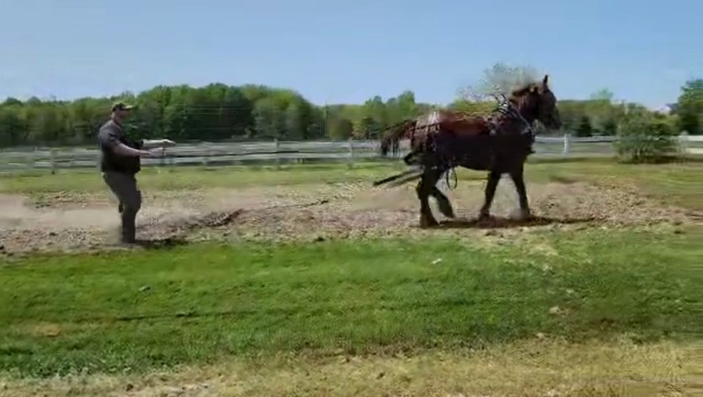 Bree, in the photo above is doing well with her training too. She is doing meaningful work. Here she drags the garden. She has hauled manure in the noisy manure spreader three times now. She isn’t bothered by the loud, squeaky machine anymore. She just gets right in to her collar and pulls with whichever teammate she is with. I am pleased with her progress so far.