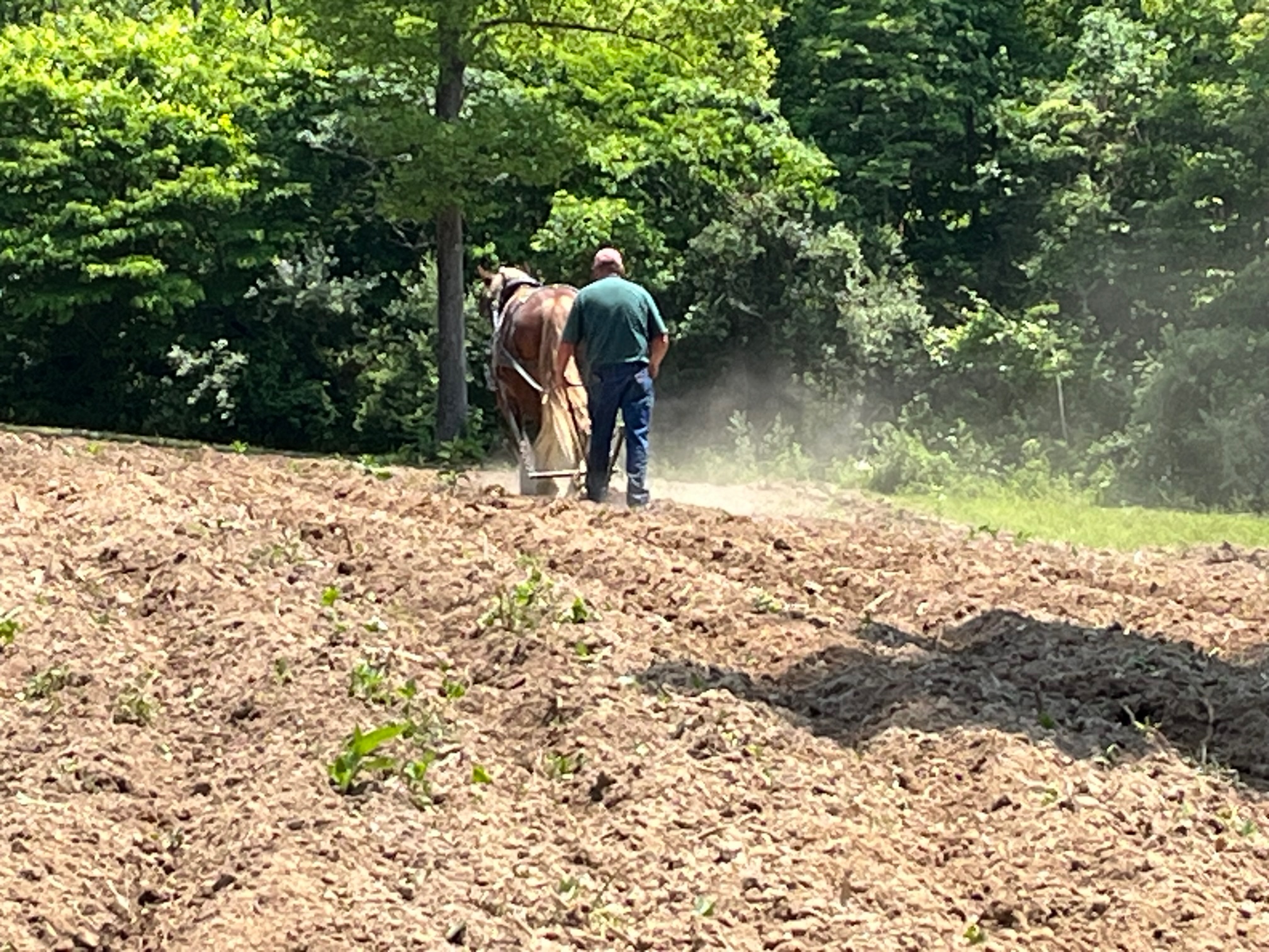 We did a little soil preparation before planting. Amee and Bree in the foreground, pulled a forecart and small disc. This was Bree’s first time off the farm. She did very well meeting other horses, all sorts of people and situations, even traffic on the road. She has a ways to go, but I was pleased with her.