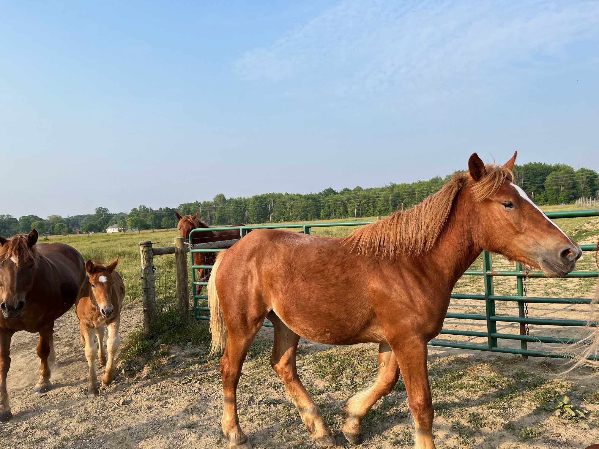 Abby and her filly foal Joy, come through the gate on the way to breakfast and the cool barn. The filly is growing very fast. She is a sweetheart. She has a lot of personality, is very tame and a “Joy” to be around!