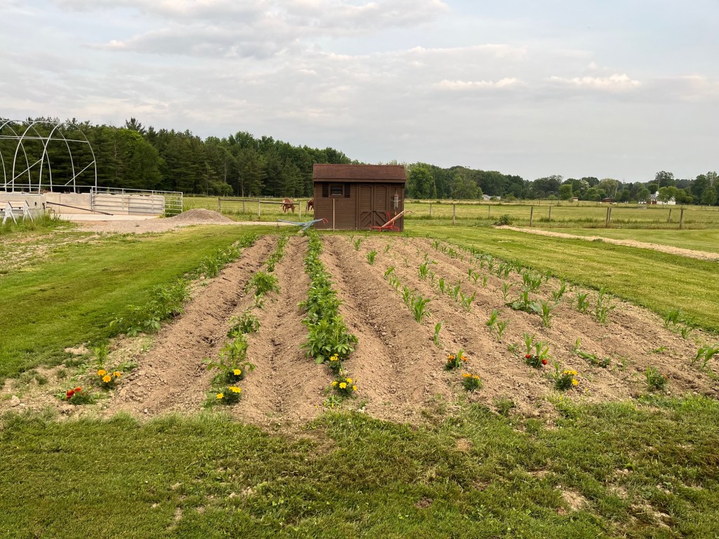 The corn is a bit spotty from the early season drought, but I have replanted in the gaps. It will all work out.