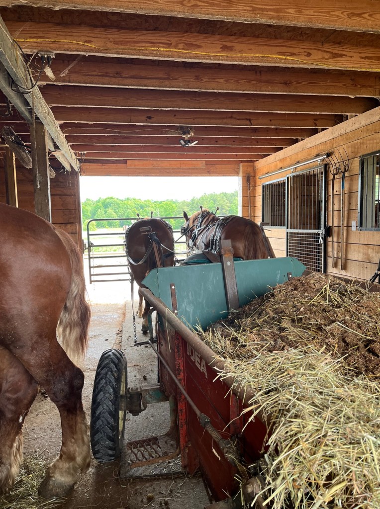 Bree, the left hand horse and Amee wait as I fill the manure spreader. Hank shows his best side as he photobombs the picture. This is all part of Bree’s training. she not only learns all about different pieces of equipment, she also needs to learn to stand quiet and wait until I ask hem to move. Like all youngsters, this is a hard lesson at times. She is doing quite well.