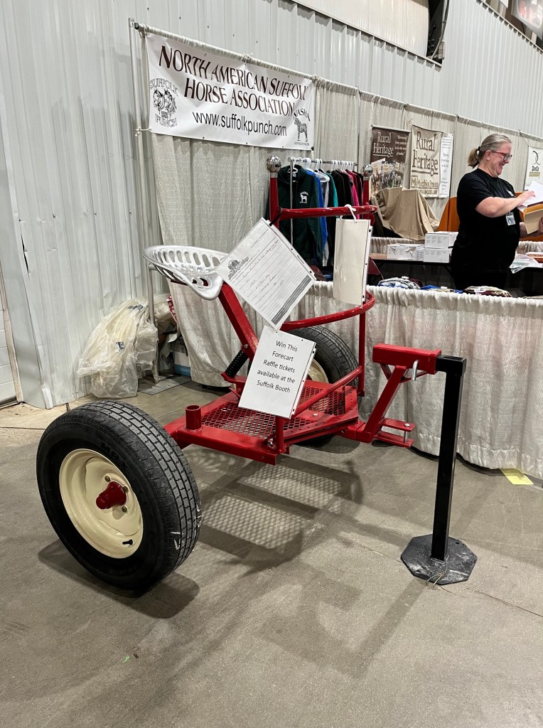 We helped out in the North American Suffolk Horse Association booth. My wife is in charge of the promotional items like t-shirts, hats and cups. Our nonprofit “Saving Suffolks” is selling tickets to win this EZ Trail forecart. Selling the tickets helps to fund our organization as we promote , present and preserve the critically endangered Suffolk horse. You can learn more by going to WWW.Savingsuffolks.com
