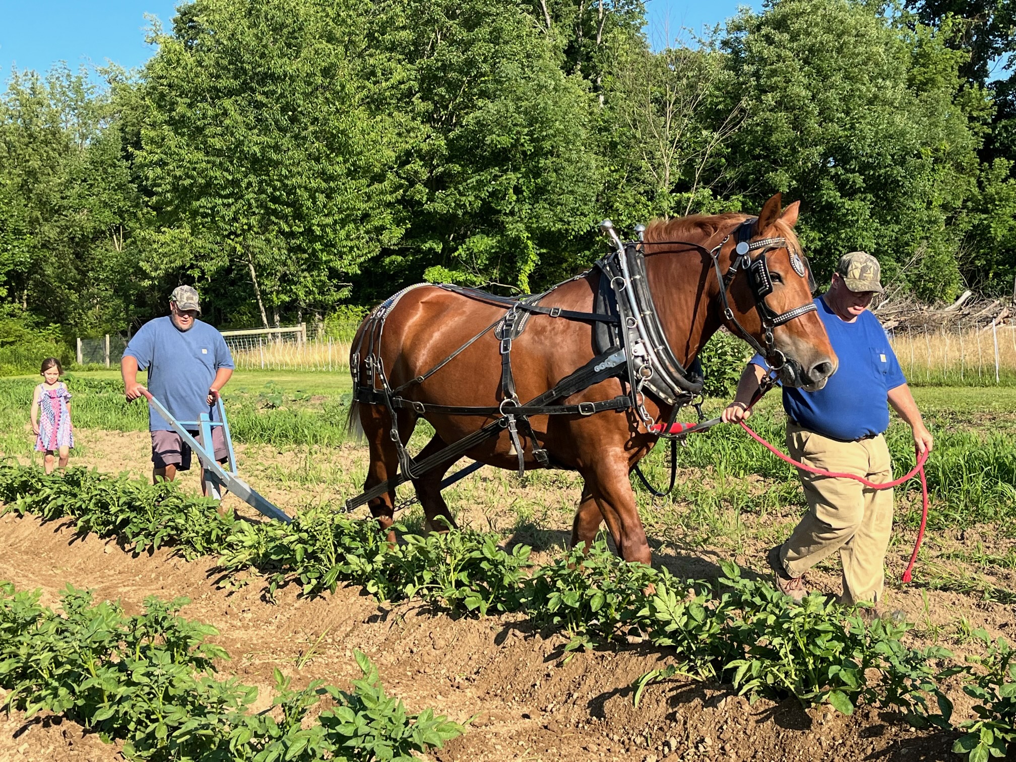 Last evening, I helped our son Josh hill his potatoes in his garden. It was the first time my Amee horse had been in the hilling plow. It was also Josh’s first time on the plow handles. We got off to a wiggly start, but soon sorted it out and completed the job.