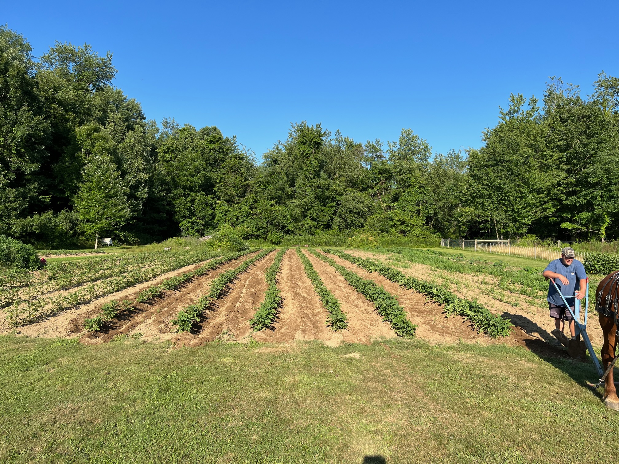 It is a family affair, the gardening and homesteading jobs at Josh’s. His wife and 4 children all pitch in and get it done. They had started hilling with garden hoes, but the hot weather and big job made the going slow. I told him I would bring the horse and see if we could help. It sure did help. They ahd a little to do by hand, but for the most part, things went very well.