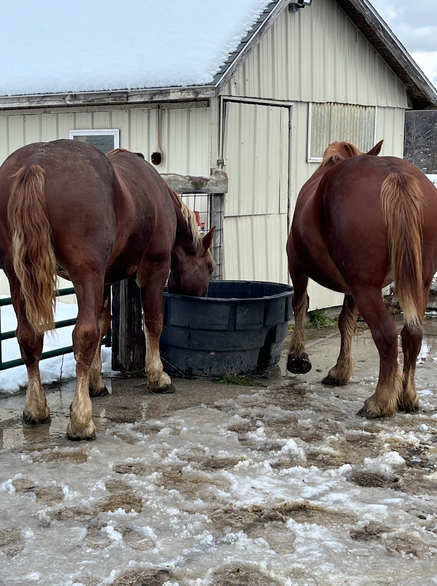 Hank and Abby in for a drink as they track up the slush. I had a few plans for today, but moved inside out of the slop quite quickly. The horses spent the night and morning inside the barn. They will spend the afternoon outside in their paddock. They love to roll in the snow.