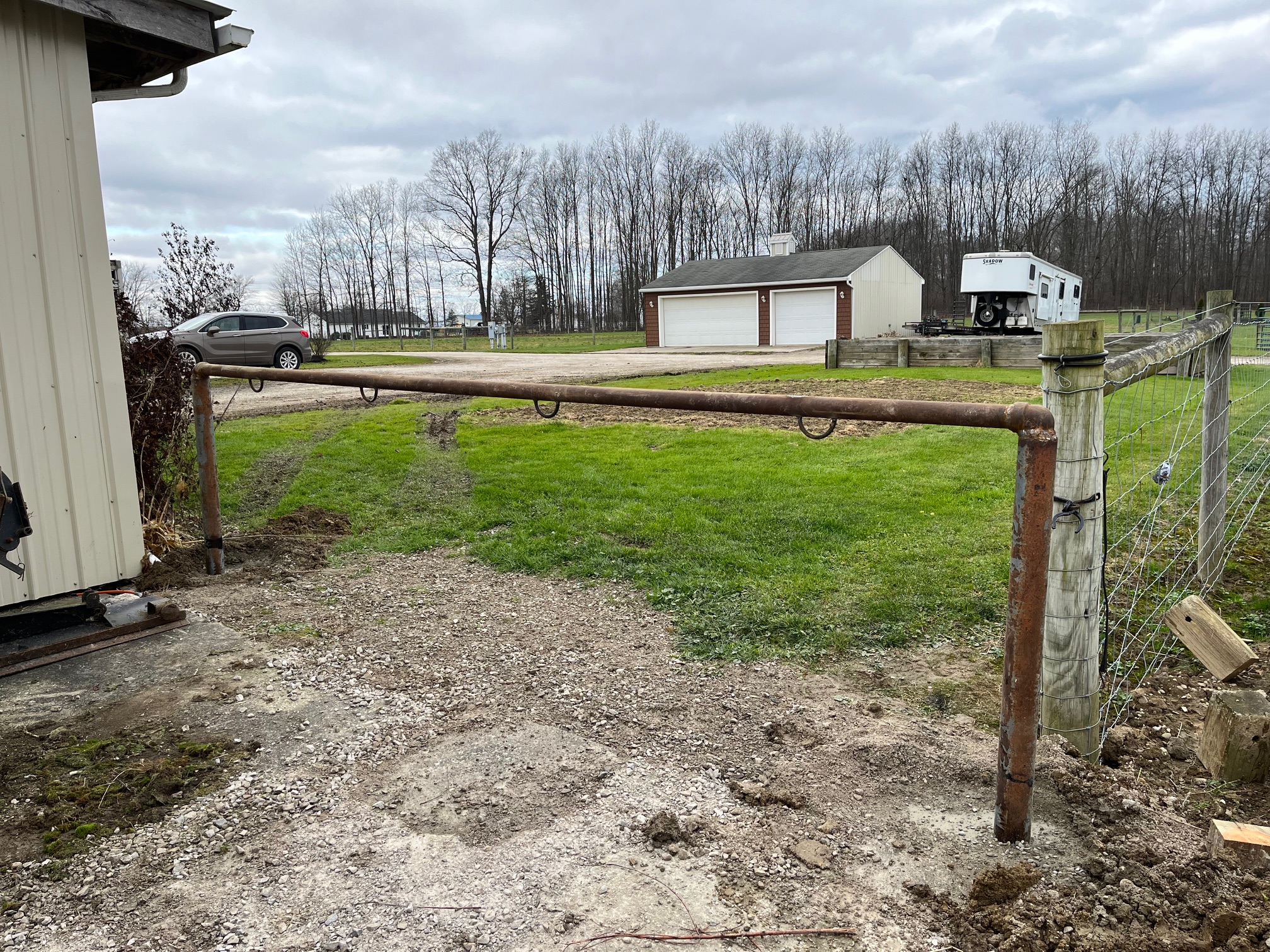 The horizontal part is in line with the fence and building, but there is enough space for a human to walk between the rail and the fence post. We didn’t want to shut off people traffic, but we don’t want horses or cows roaming the yard when we use the drive as an animal lane.
