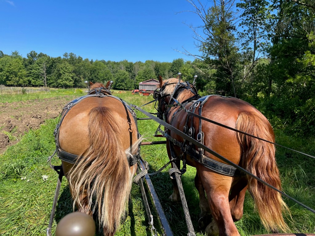 From left to right; Grace our two year old. She was our baby that fell down the hand dug well. She has started her training and will very soon be a part of our farming operation. Next is our matron mare Rosie. She came to us from Canada. She is a full sister to our son’s horses and a half sister to three of ours. She is expecting her first foal in 2024 with our stallion Hank.