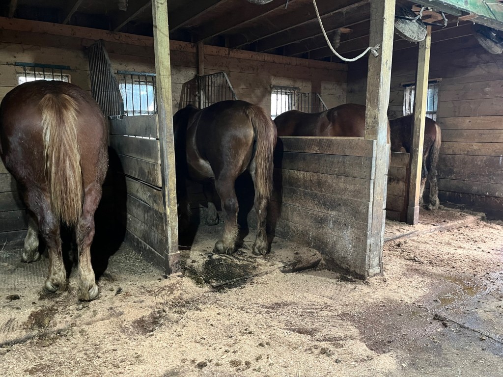The third horse is our yearling filly Maggee. She is Grace’s full sister. Maggee has a pushy attitude, so we have started her training a bit early to keep her mind occupied and her manners in check. The fourth horse is our 2023 baby Joy. She is learning barn manners and all that comes with being a draft horse. She is a sweetheart and is doing well. Joy is Abby and Hank’s first baby. We really like what we see.